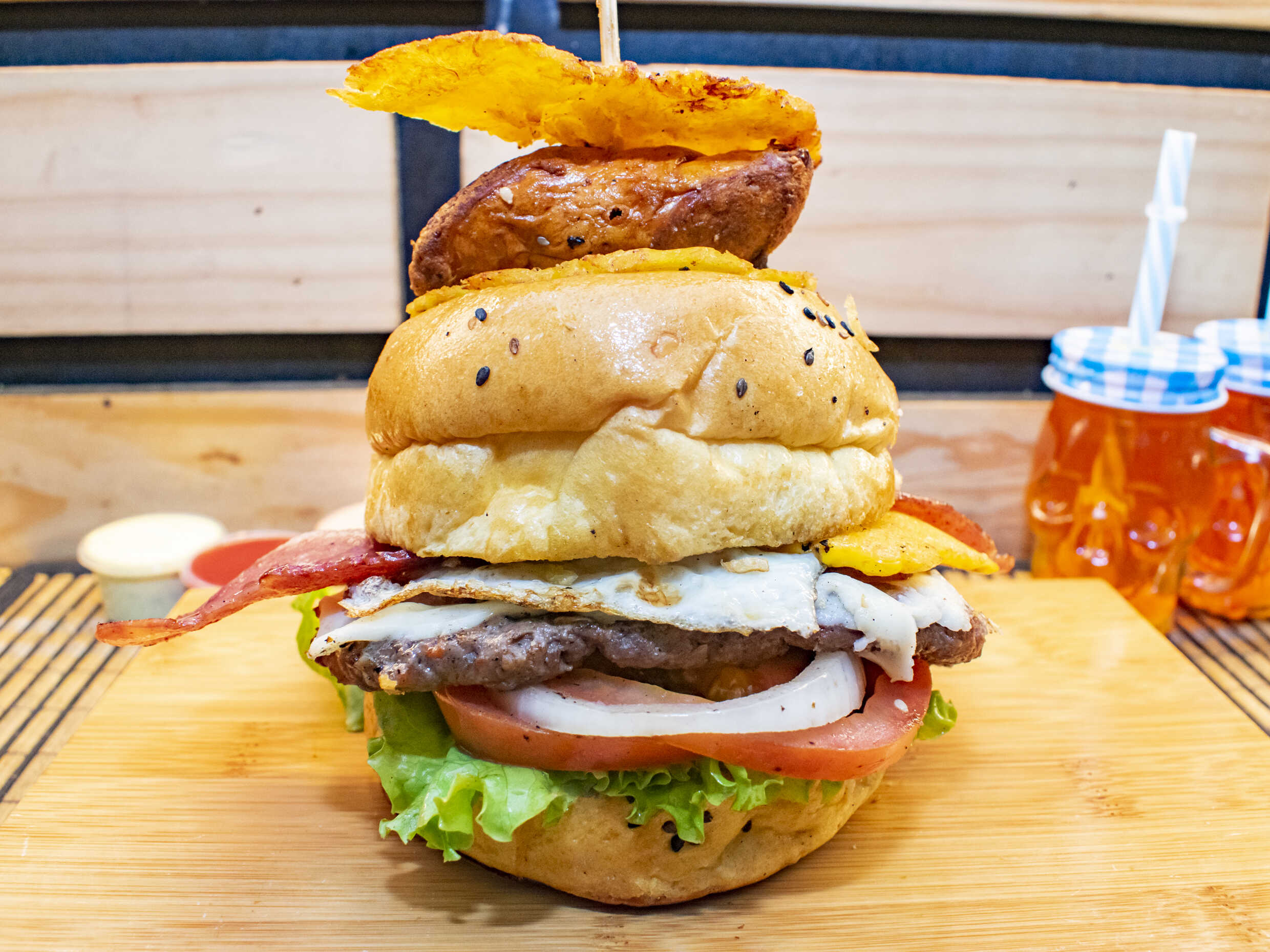 Pan artesanal, lechuga crespa, tomate, cebolla caramelizada, carne artesanal 180 g, chorizo, queso fundido, jamón, tajadas de plátano maduro, tocineta, huevo, papas chips y salsas de la casa.