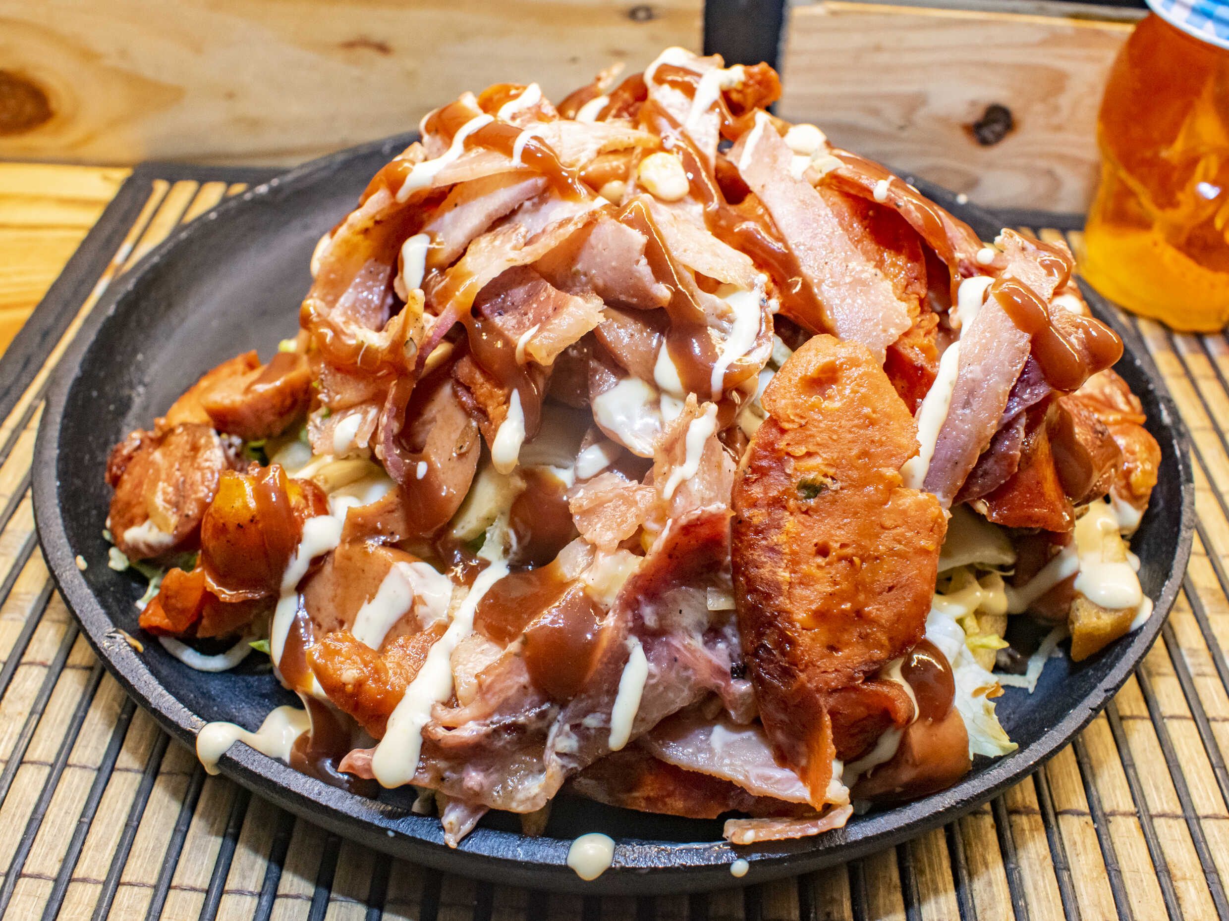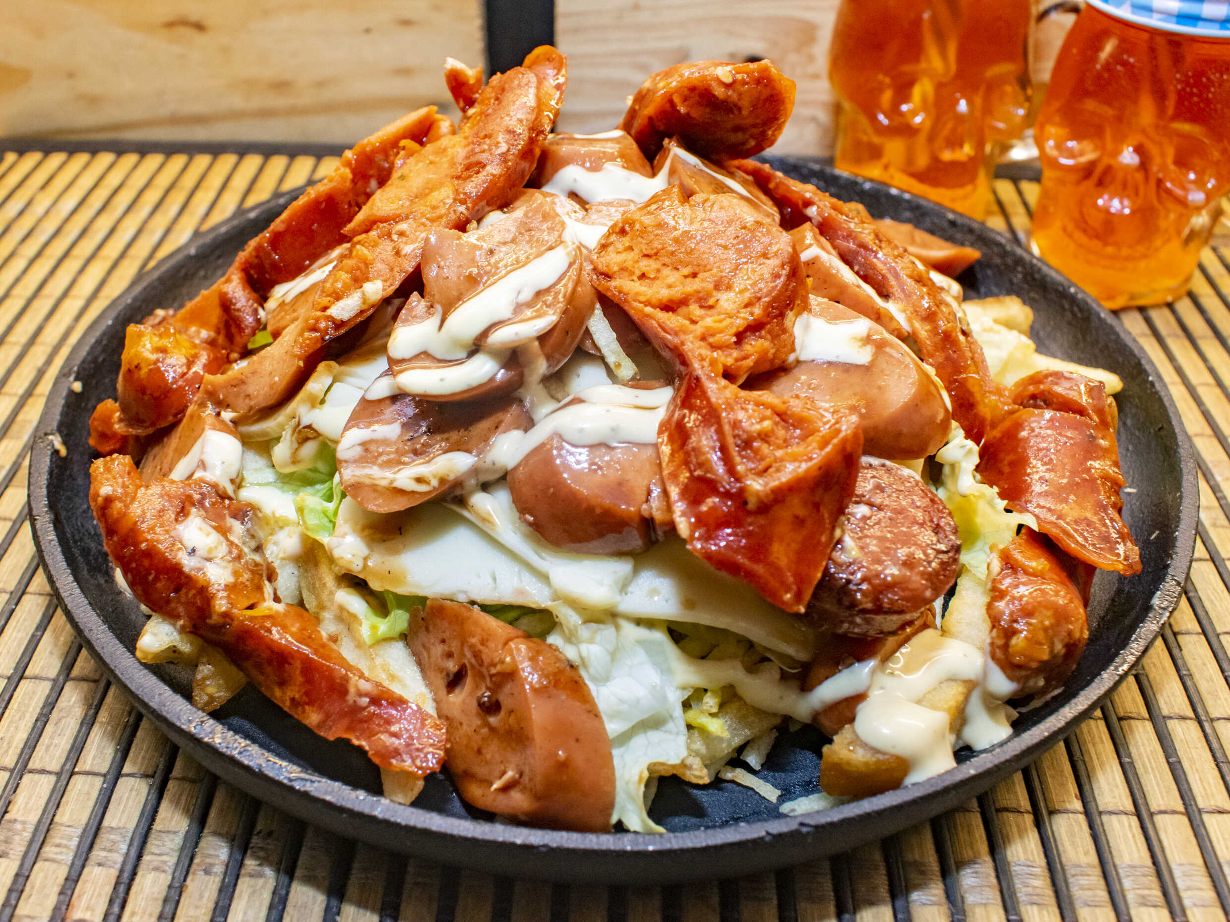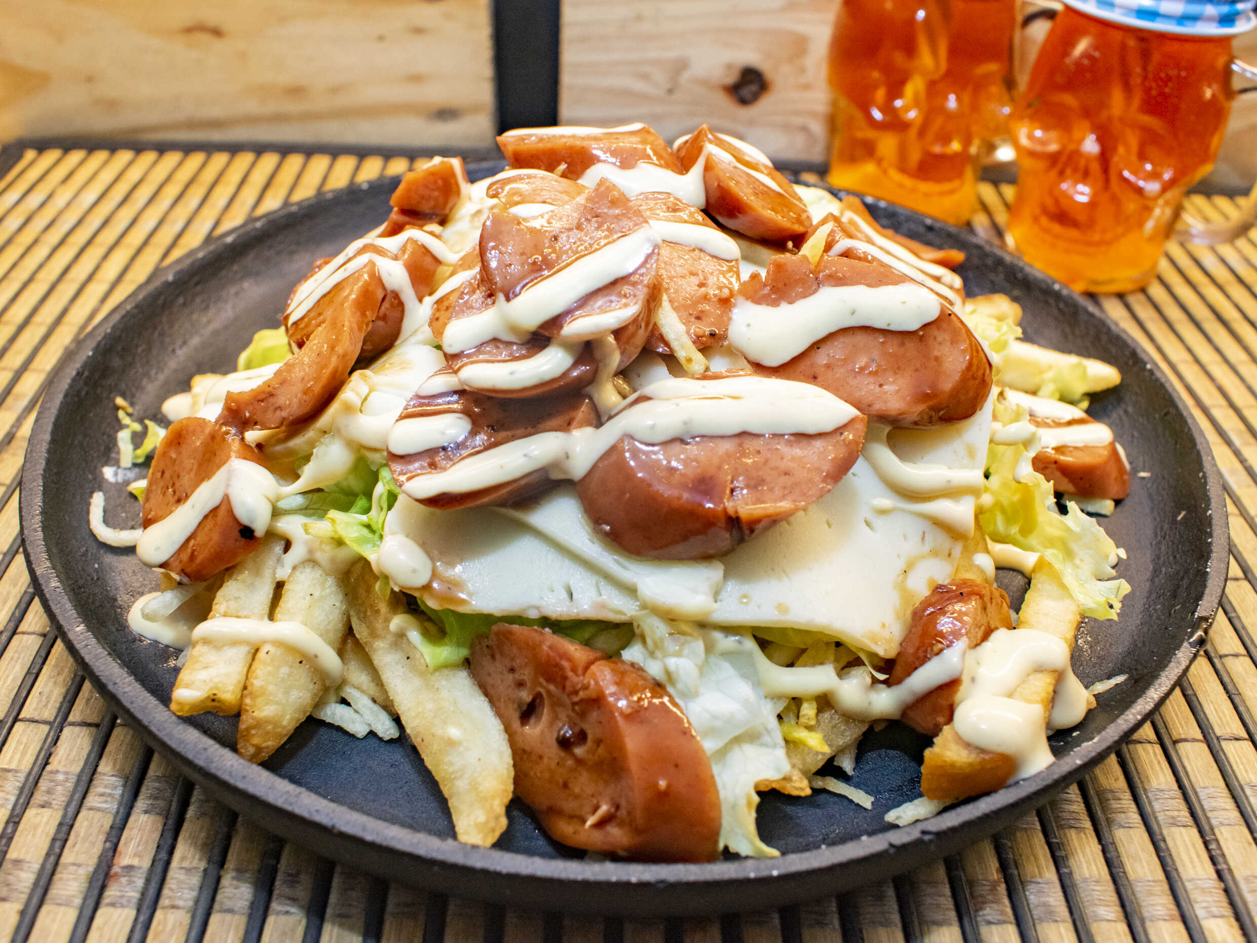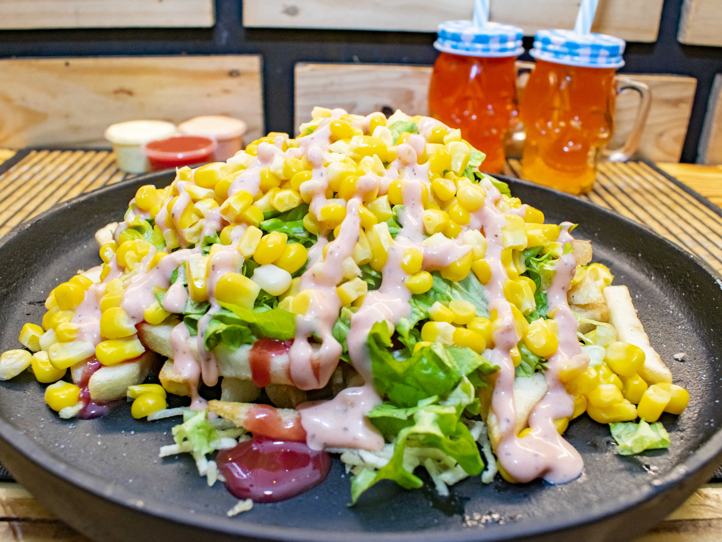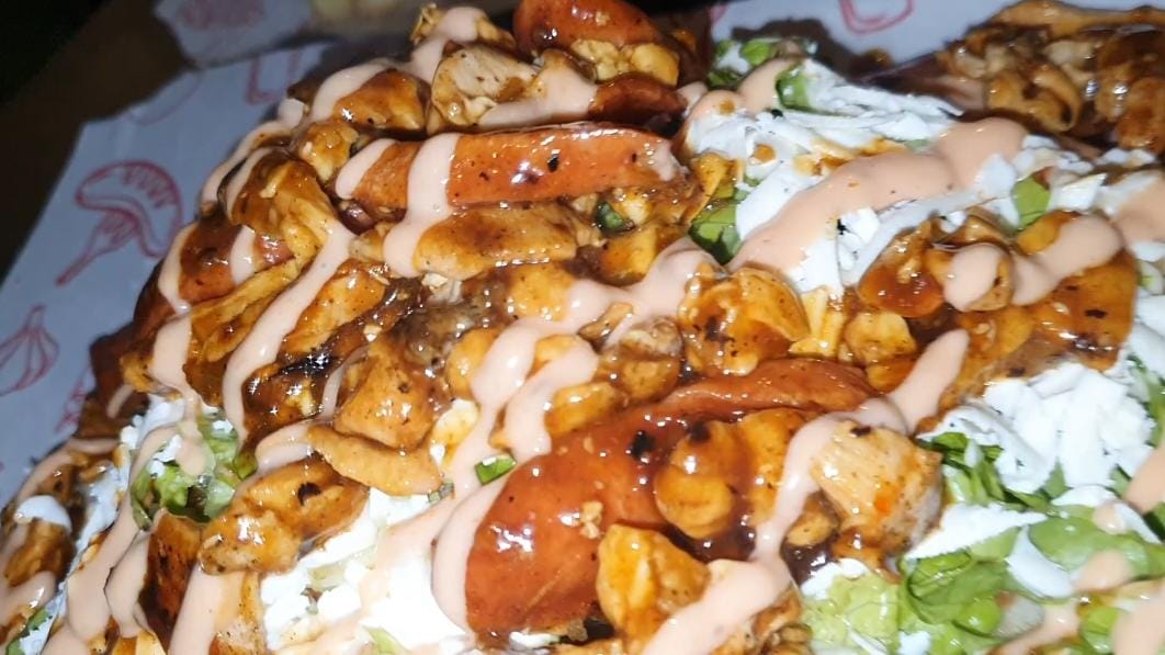 Papa francesa, lechuga lisa, papa chips, chorizo artesanal, morcilla, aderezo picante, queso gratinado, mazorca desgranada, salsa de la casa