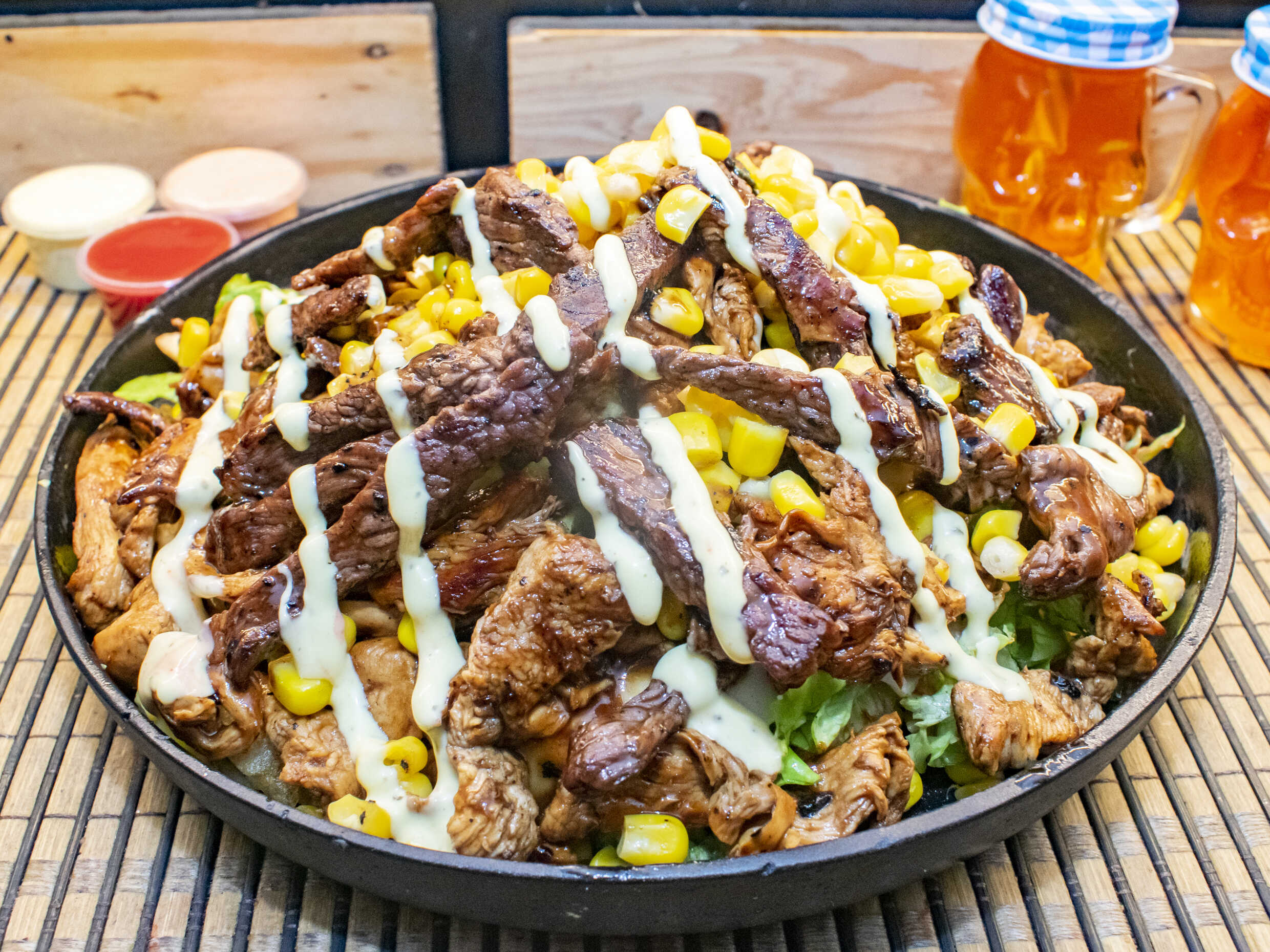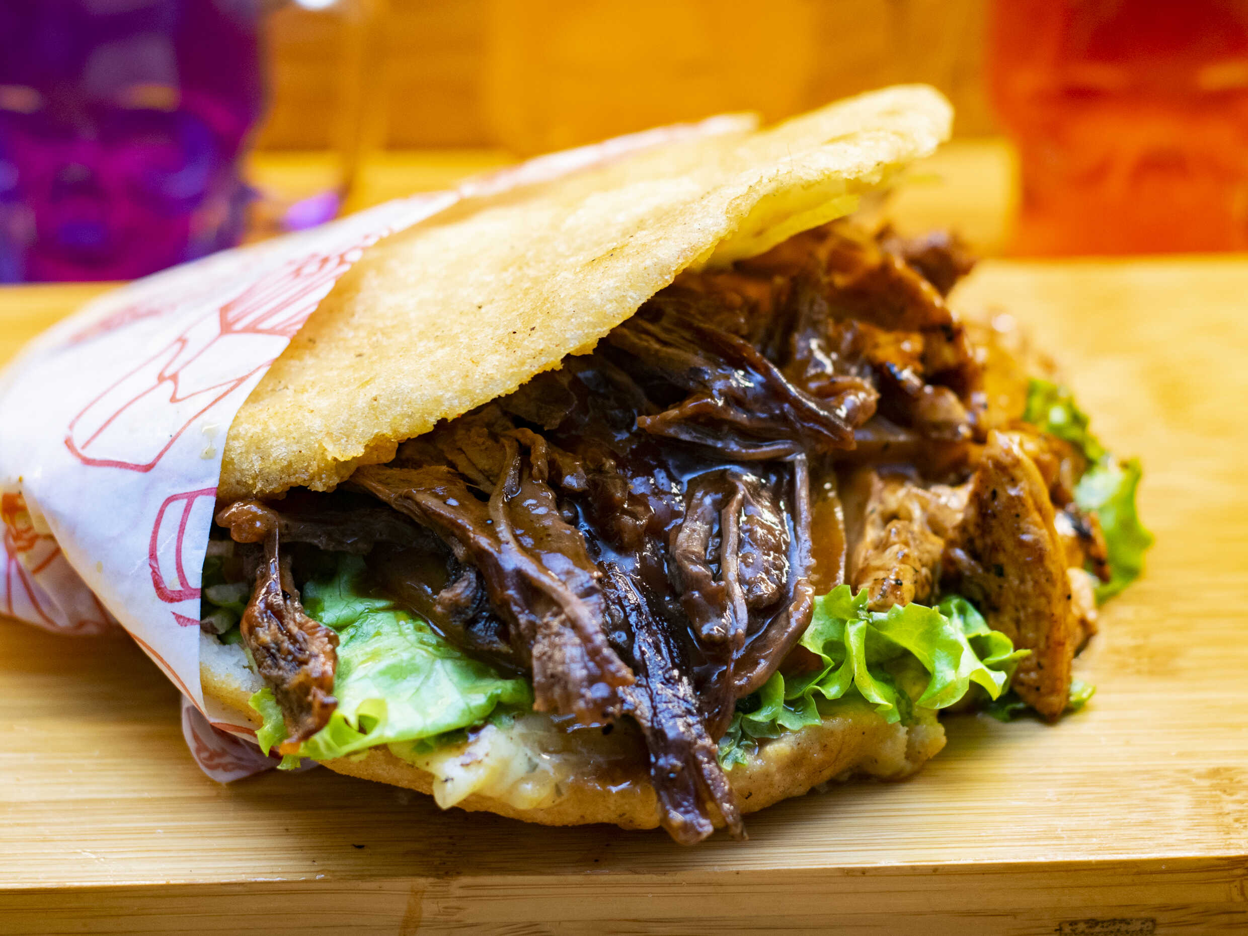 Arepa rellena de mantequilla, tomate, lechuga, cebolla caramelizada, carne desmechada, pollo desmechado, queso gratinado, salsas de tomate y mayonesa.