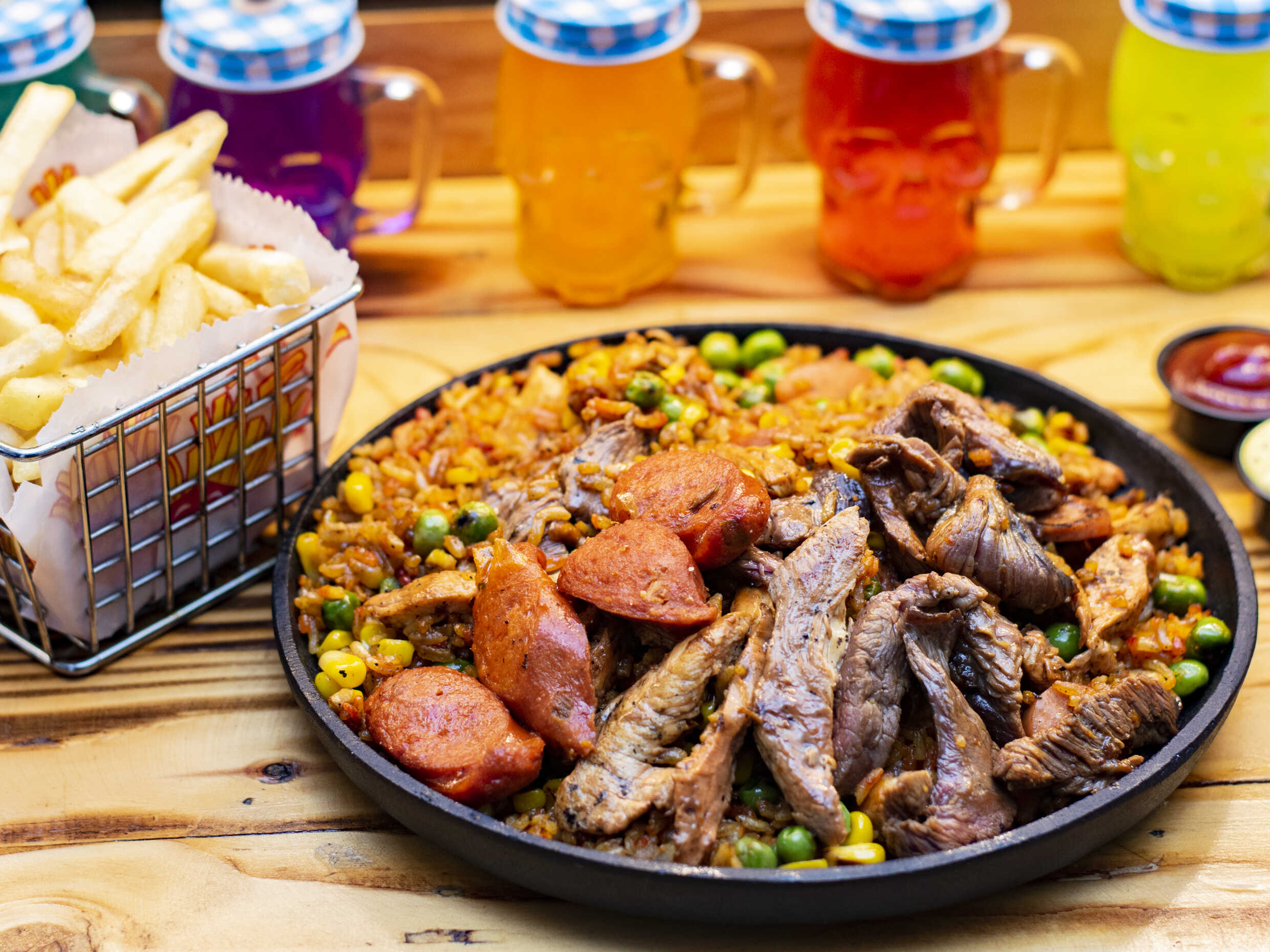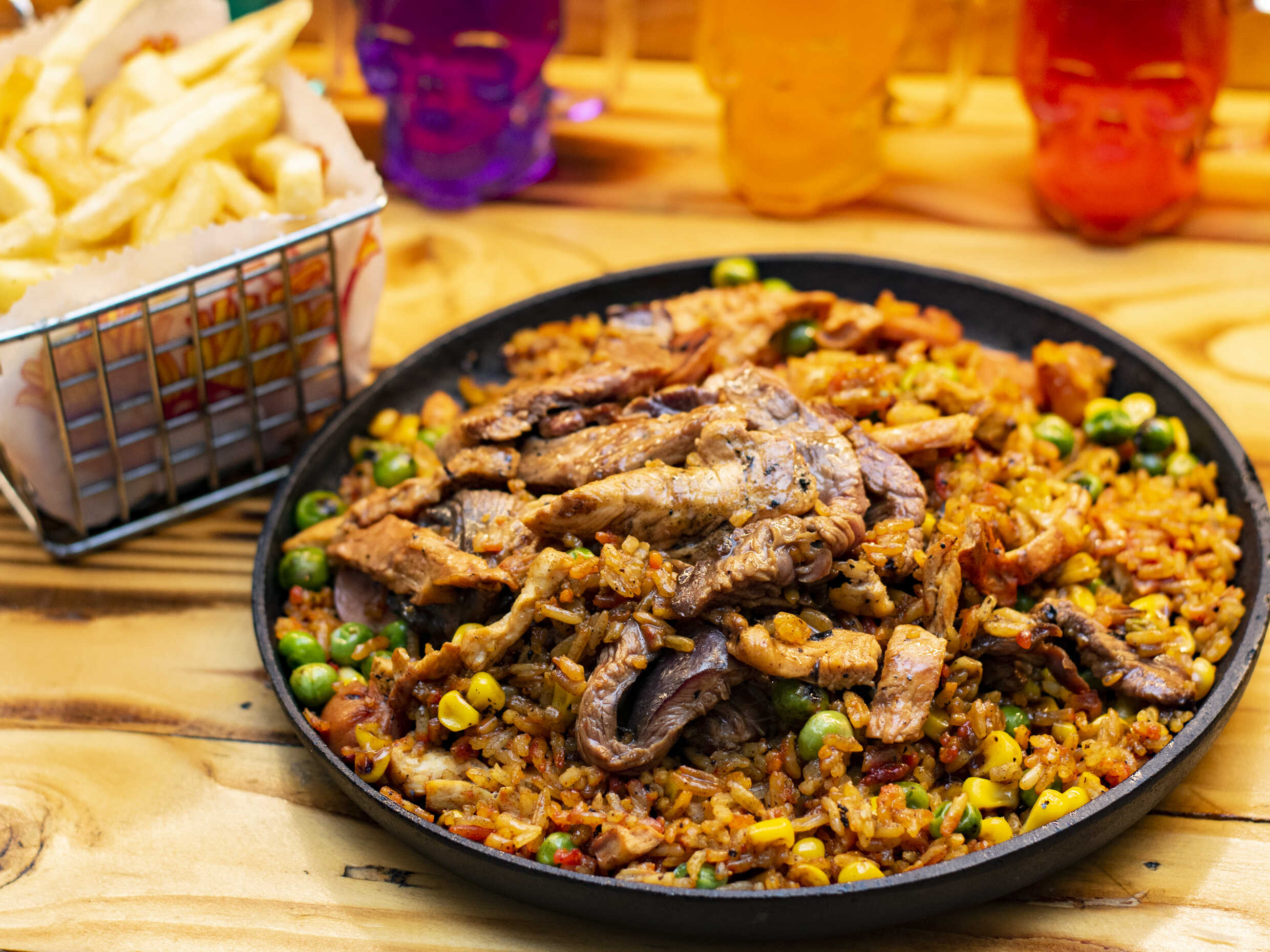 Arroz de 150 g, carne en juliana, trocitos de pollo, salchicha, maíz tierno, chorizo, cebollín, papa a la francesa.