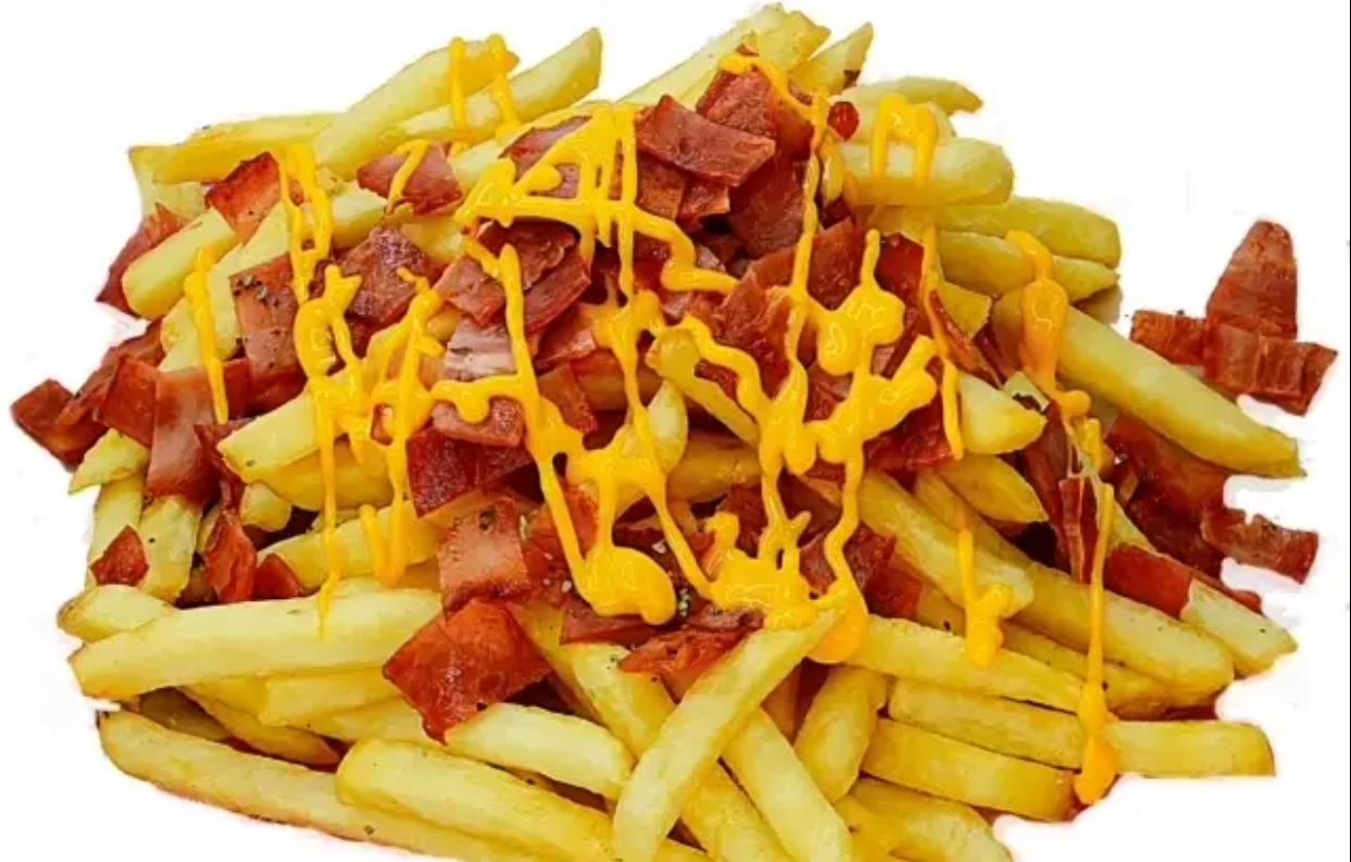 Papa francesa, salsa queso cheddar, tocineta en trozos, queso costeño papa rippio, salsa de la casa