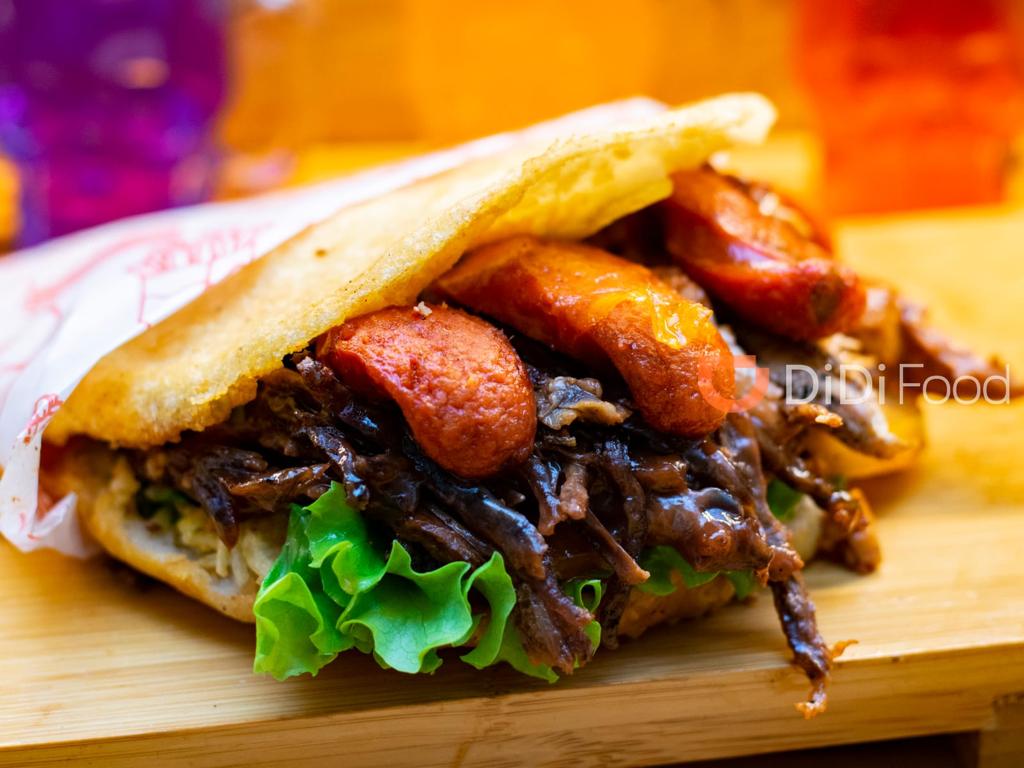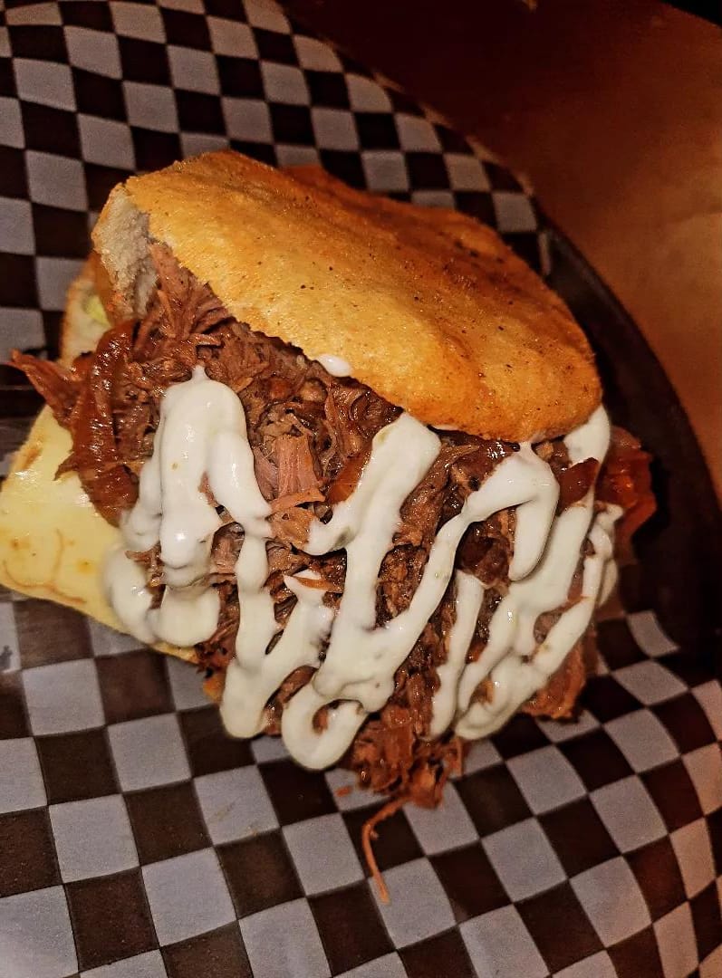 Arepa rellena de mantequilla, tomate, lechuga, queso gratinado, carne desmechada, cebolla caramelizada, salsas de tomate y mayonesa.