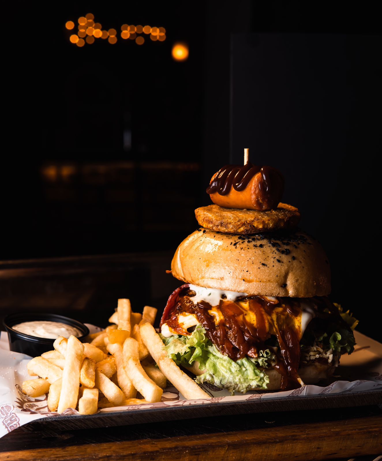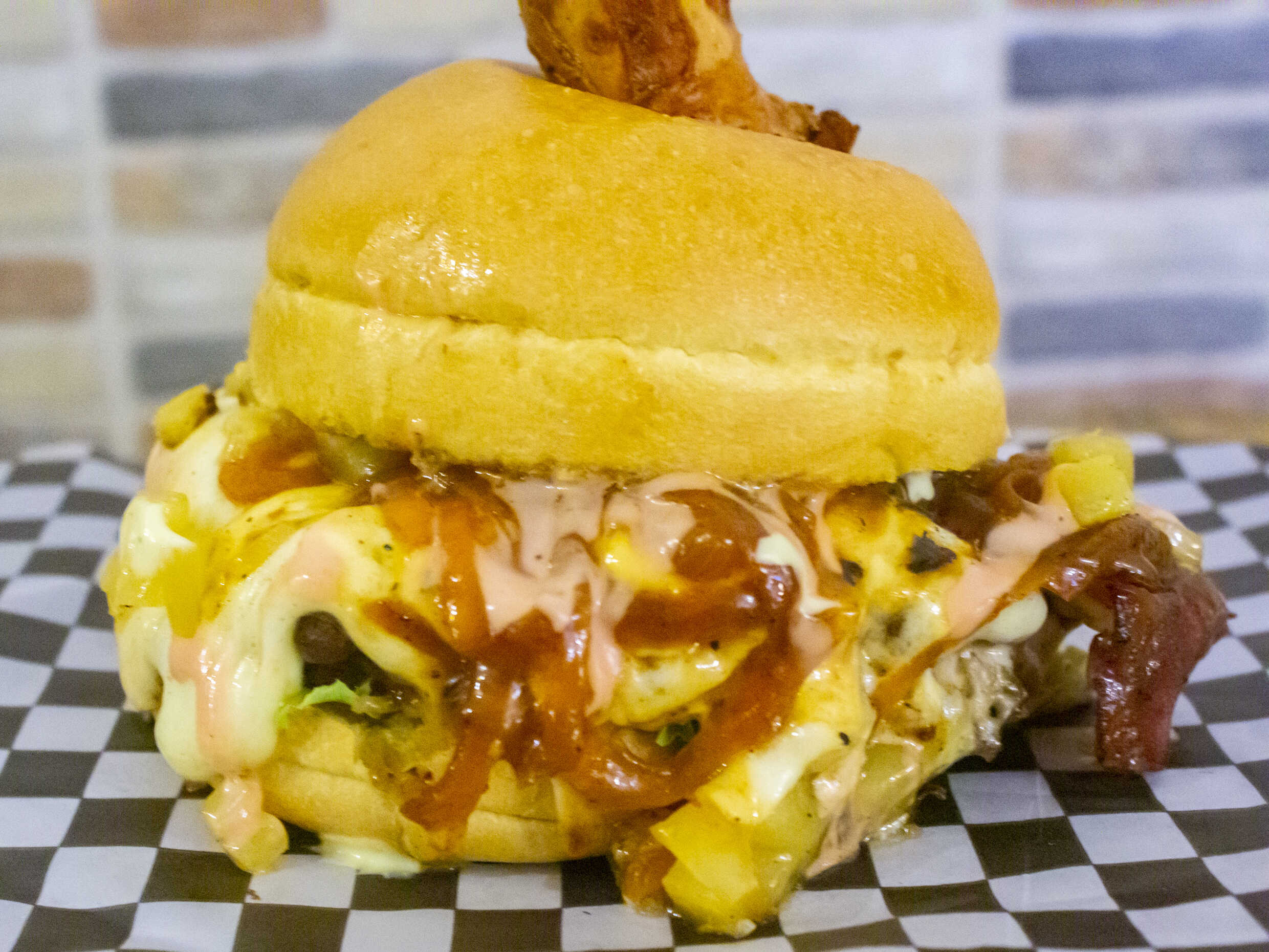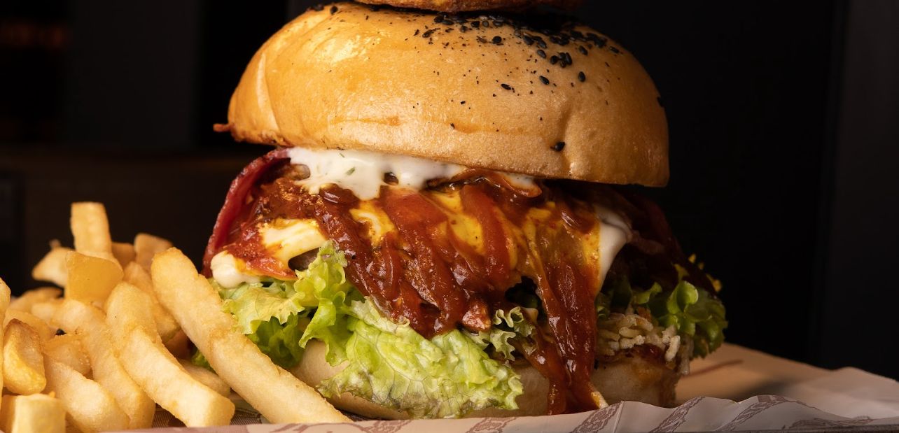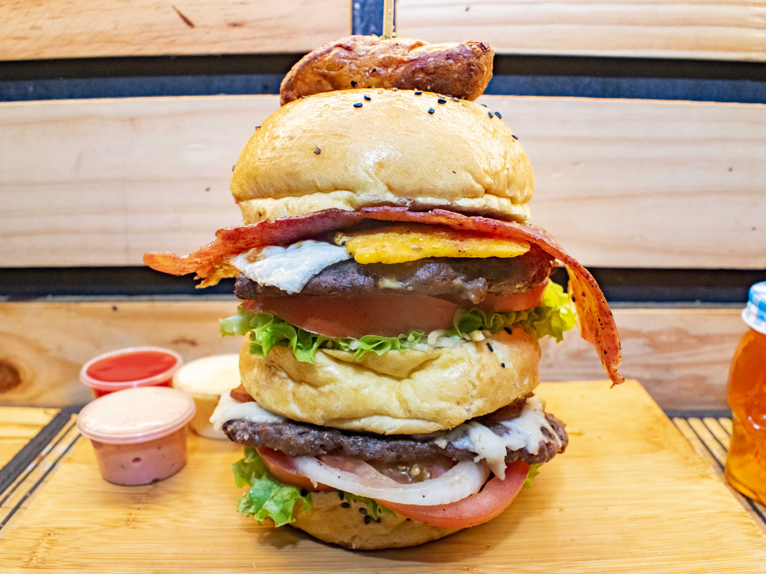 Doble pan artesanal, lechuga crespa, tomate, cebolla caramelizada, doble carne artesanal 180 g, chorizo, jamón, doble queso fundido, huevo frito, tocineta ahumada, papa, salsas de la casa.