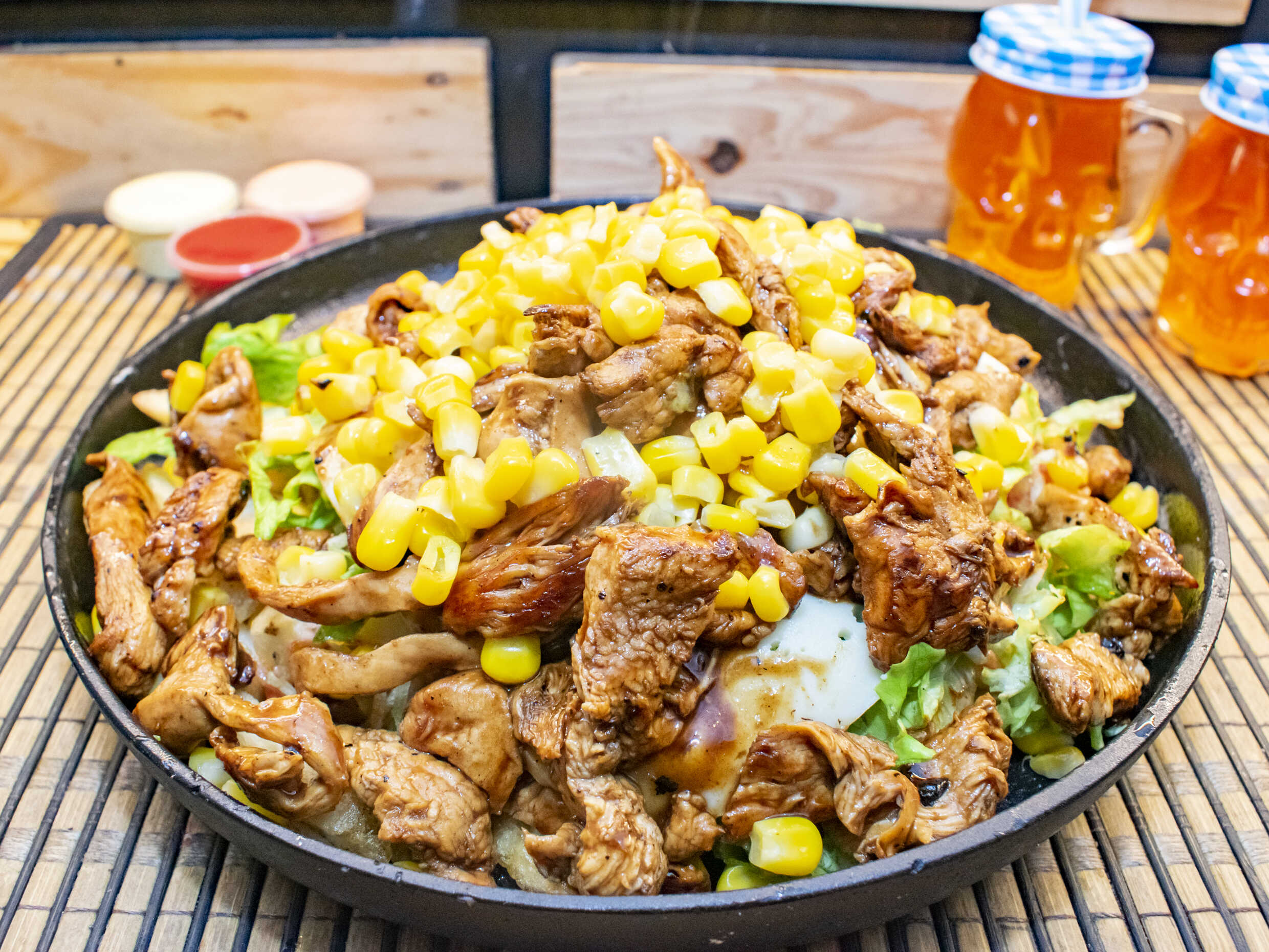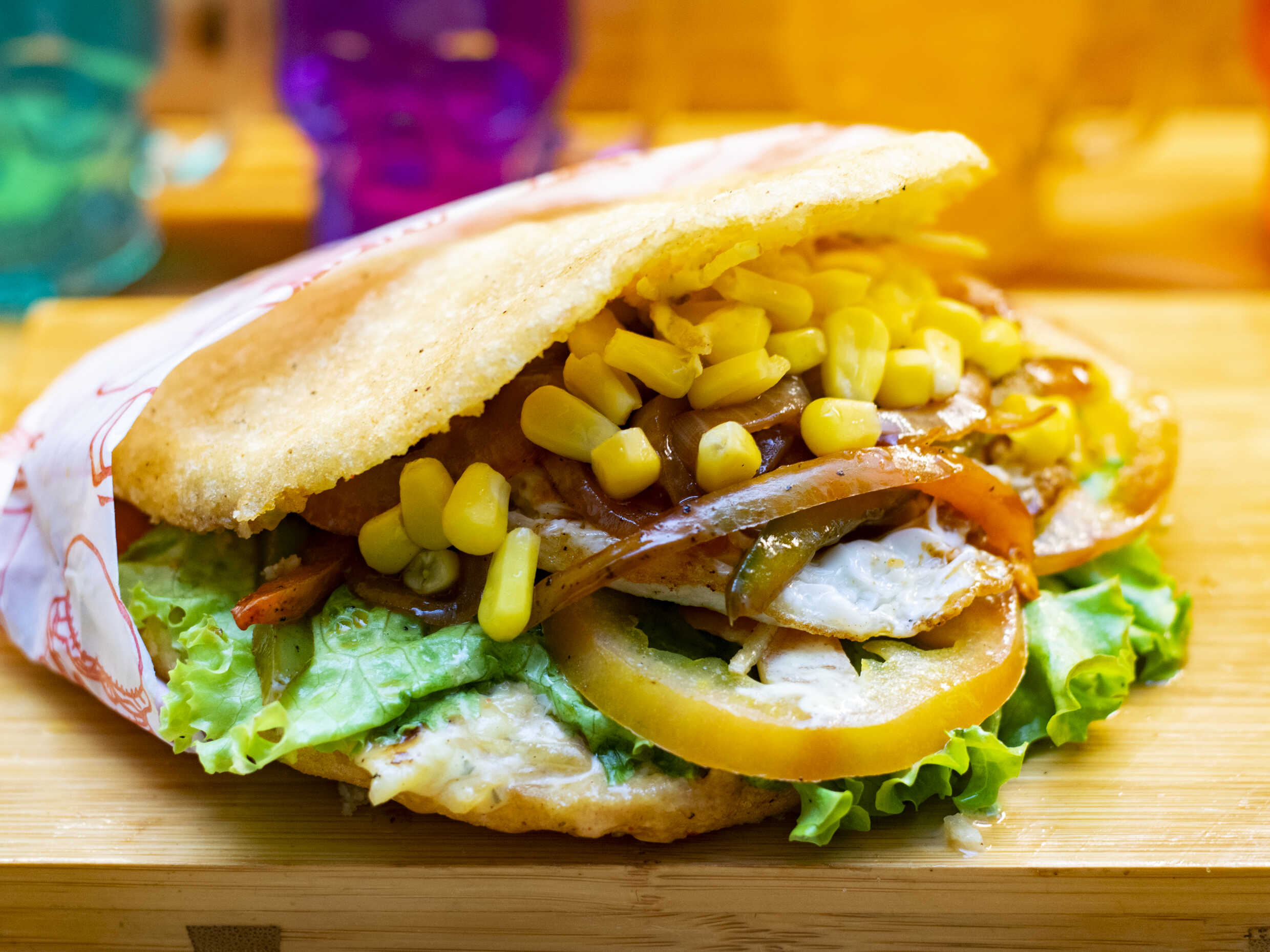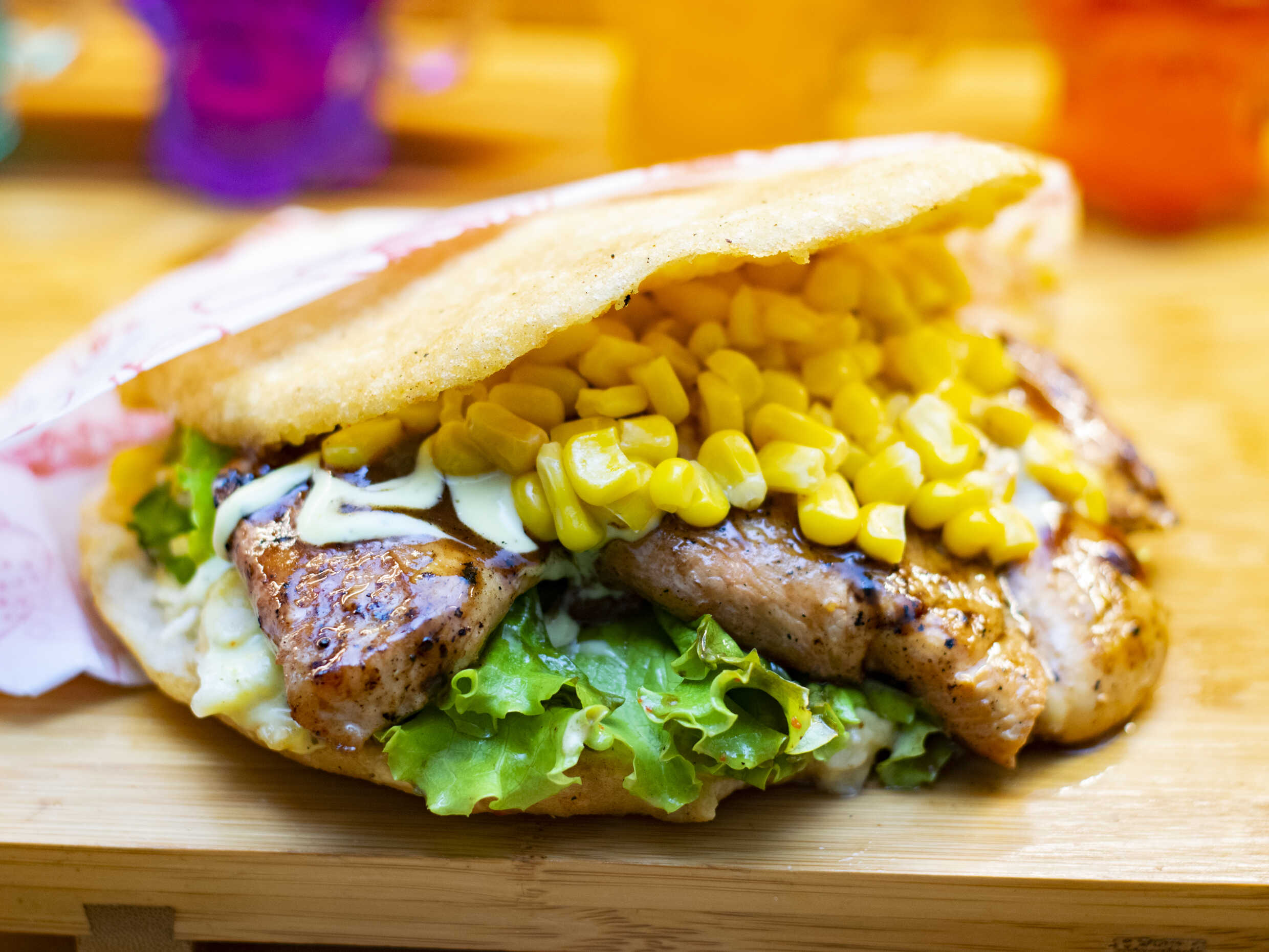 Arepa rellena de mantequilla, pollo o carne, queso gratinado, mazorca desgranada, cebolla caramelizada, salsas de tomate y mayonesa.