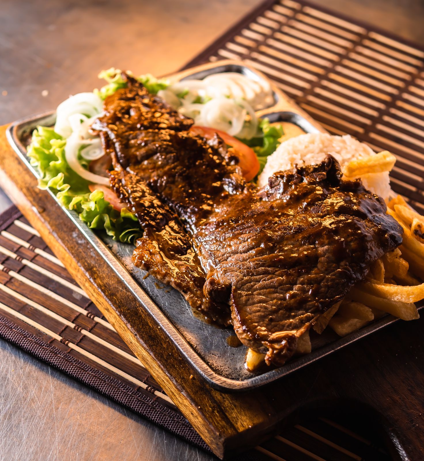 Churrasco (180g) Acompañado de Papa criolla, Arroz blanco, Ensalada y salsa de la casa.