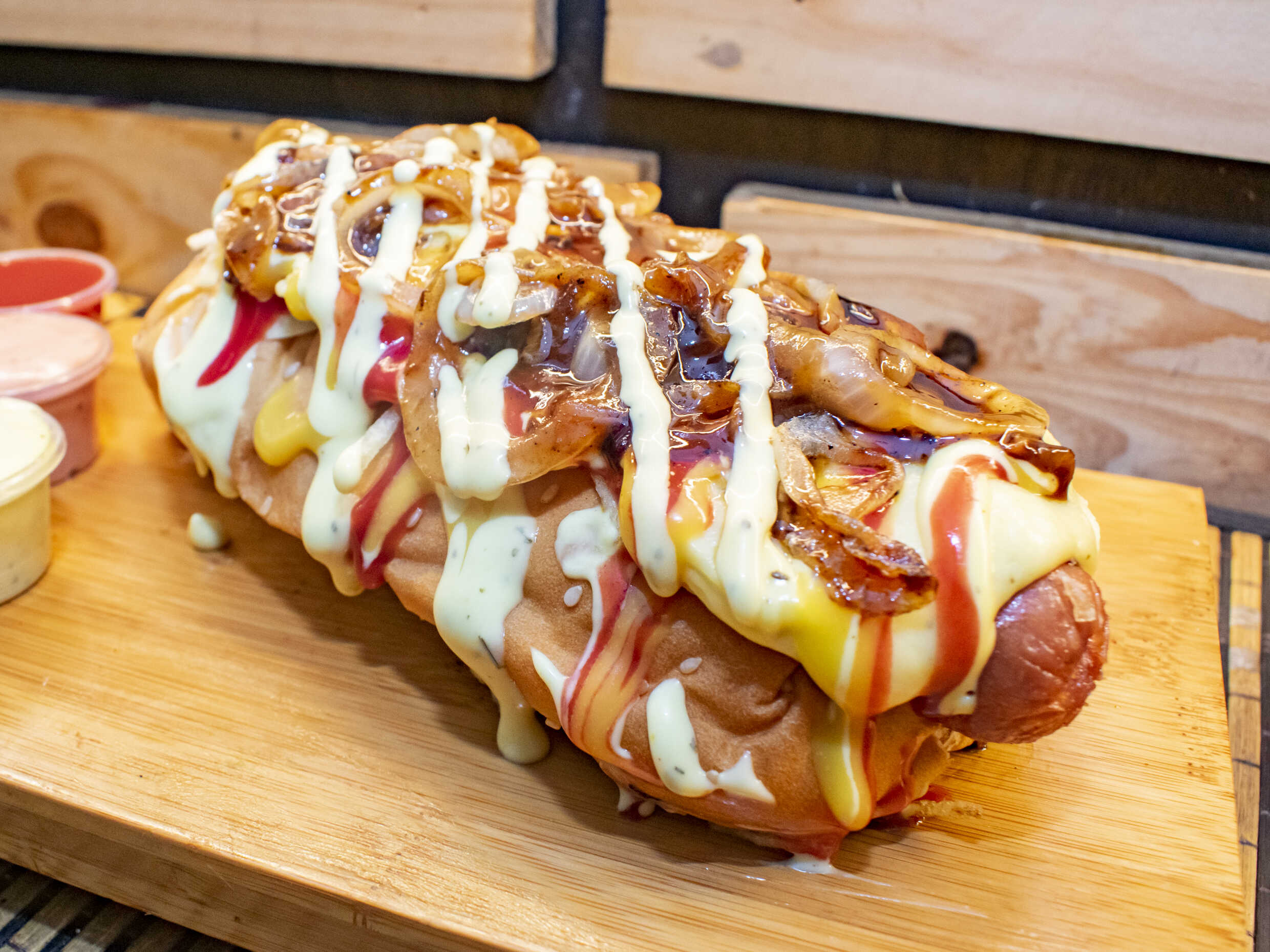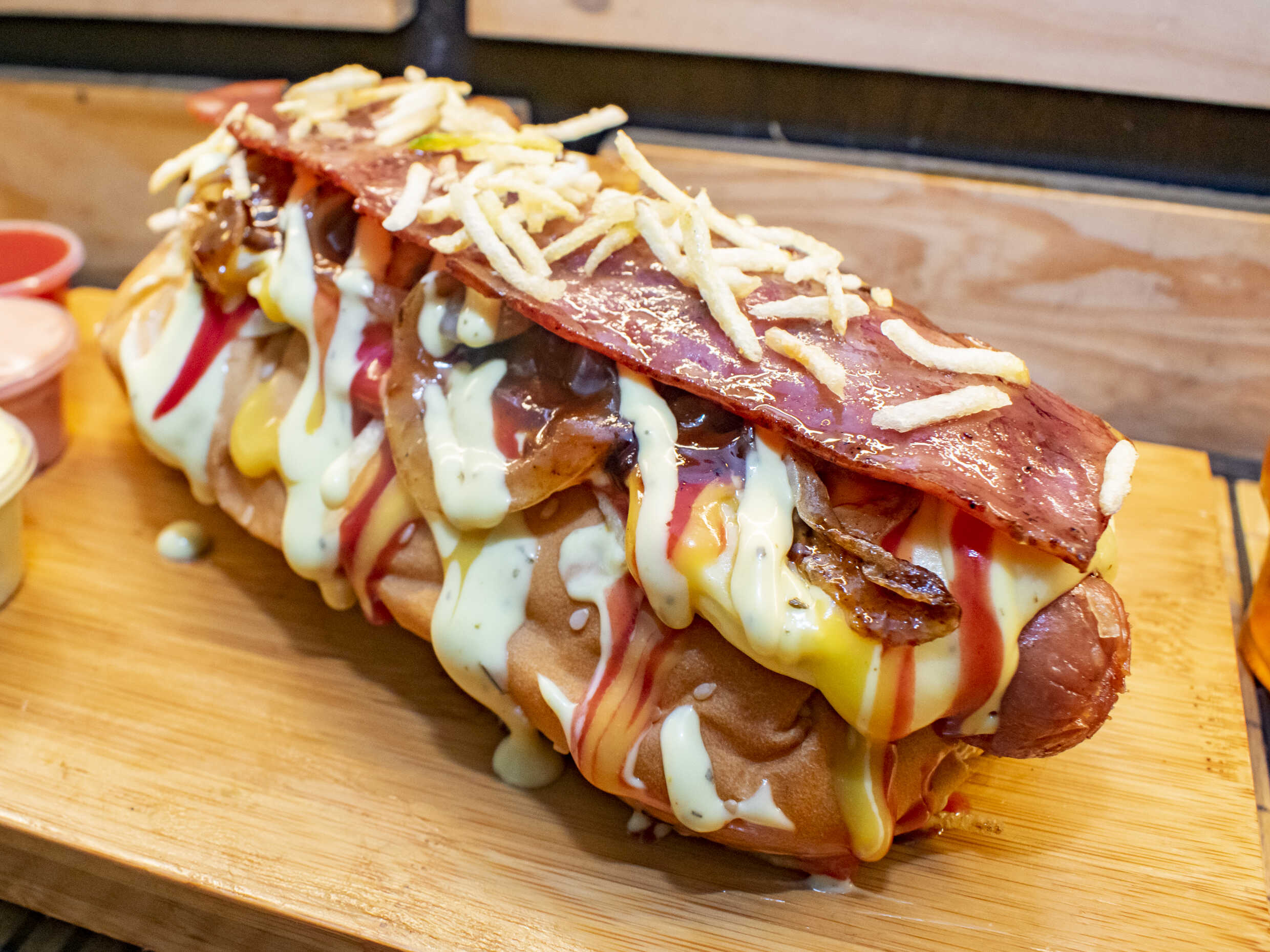 Pan artesanal, salchicha americana Zenú, tocineta, papas chips, queso gratinado, cebolla caramelizada, salsas, mayonesa y tomate.