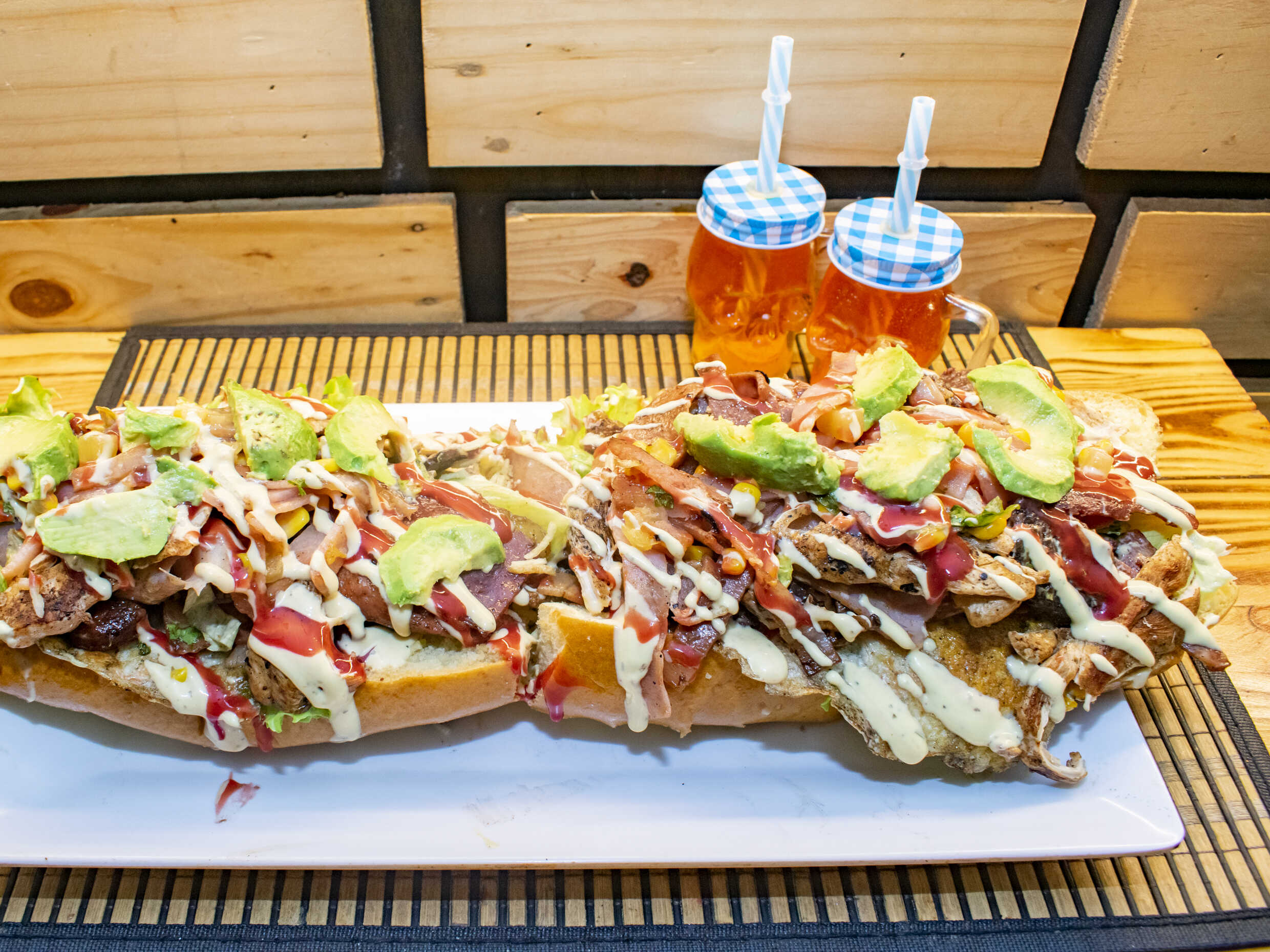 Pan artesanal familiar, lechuga, tomate, queso doble crema o costeño, carne, pollo, chorizo, tocineta, huevo frito, mazorca desgranada, Guacamole, huevo frito, papas chips, salsas de mayonesa y tomate.