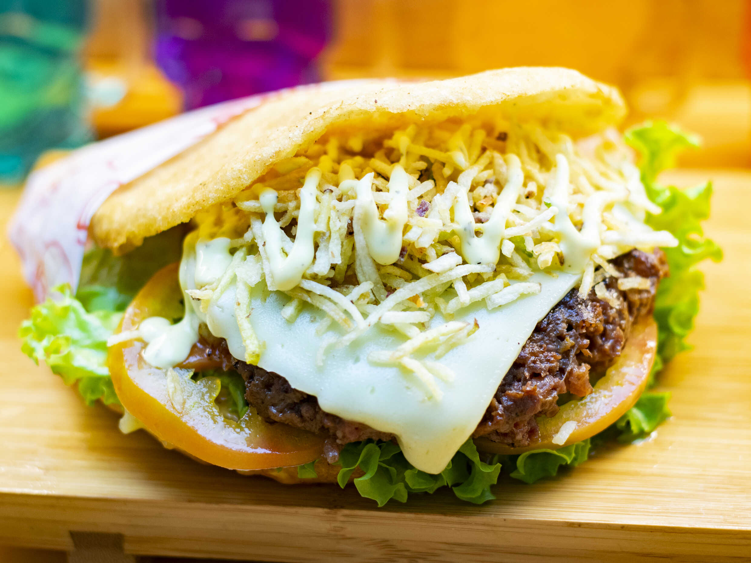 Arepa rellena de tomate, cebolla caramelizada, lechuga, carne artesanal 180 g, papitas chips, cebolla caramelizada, salsas de tomate y mayonesa.