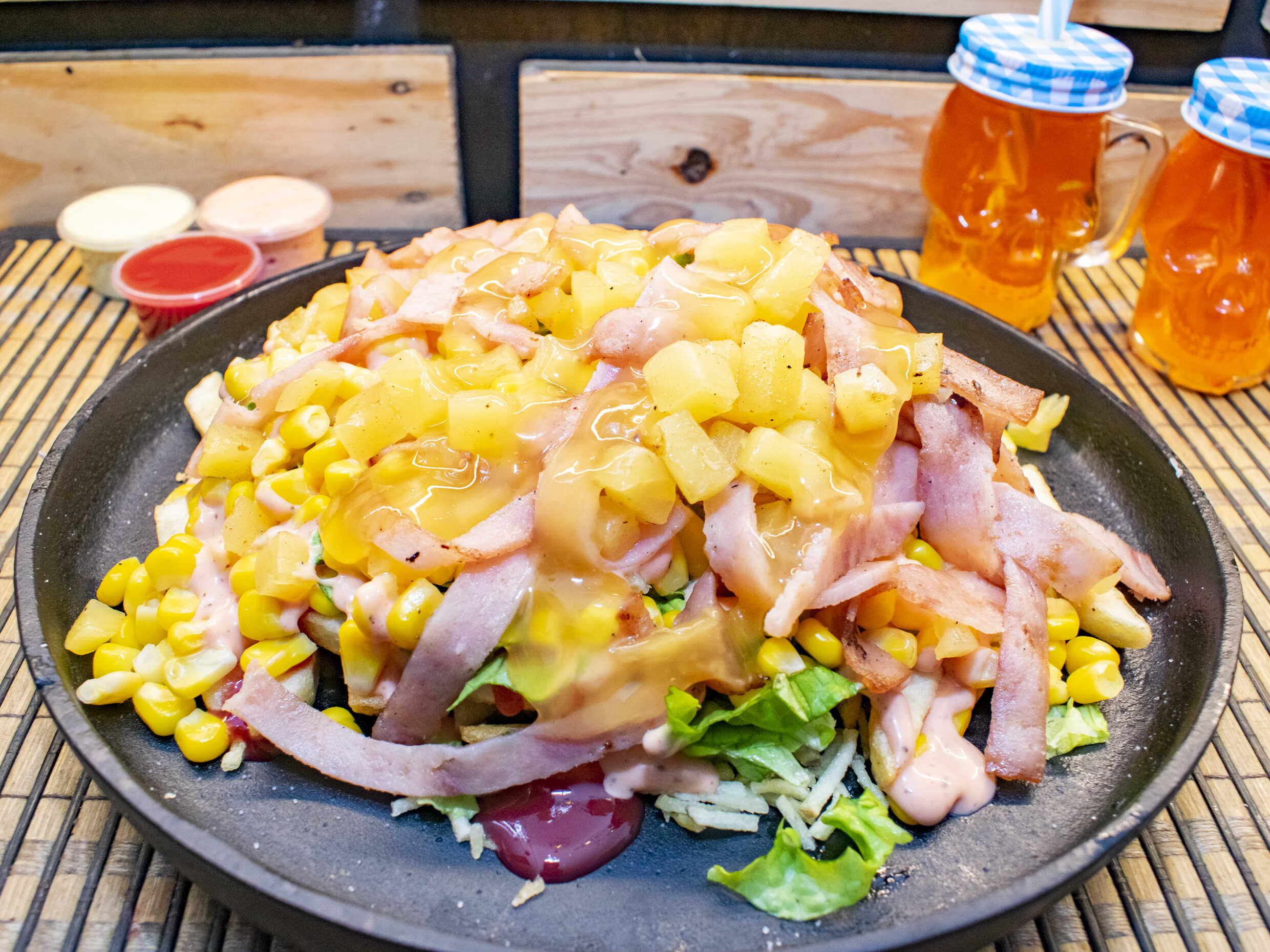 Papa francesa, lechuga lisa, papa chips, piña, jamón ahumado, queso costeño, mazorca desgranada, salsas de la casa