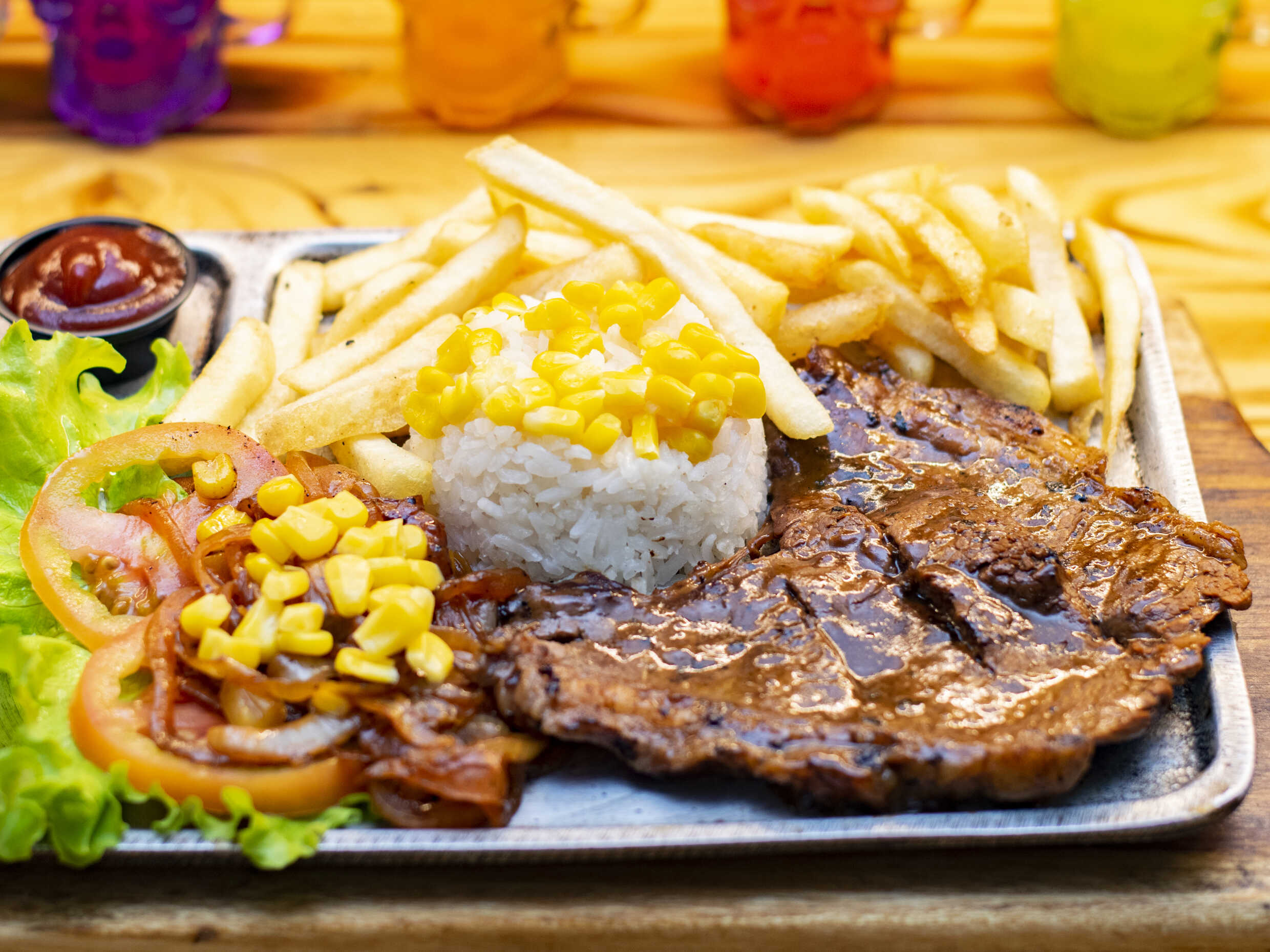 Arroz salteado 150 gr con trocitos de jamon, cebollón, huevo, soya, mazorca desgranada y papas a la francesa