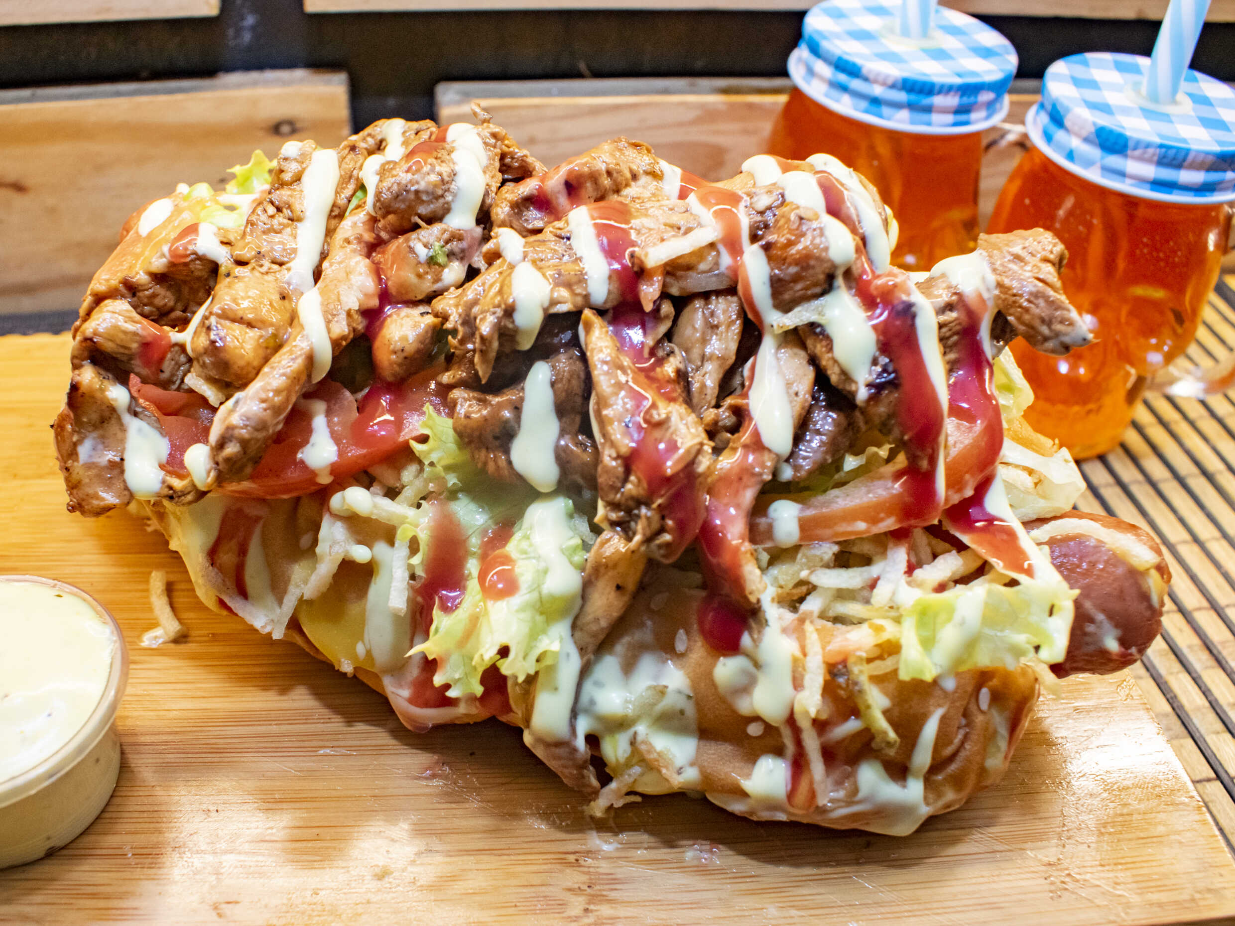 Pan artesanal, lechuga, tomate, cebolla caramelizada, carne artesanal 180 g, chorizo, queso fundido, jamón, filete de pechuga, papas chips, salsas de la casa.
