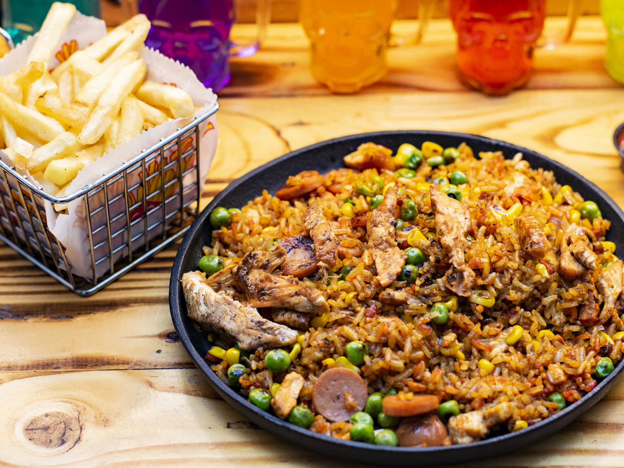 Arroz 150 g, pollo desmechado, salchicha tradicional, arveja, mazorca desgranada papa a la francesa