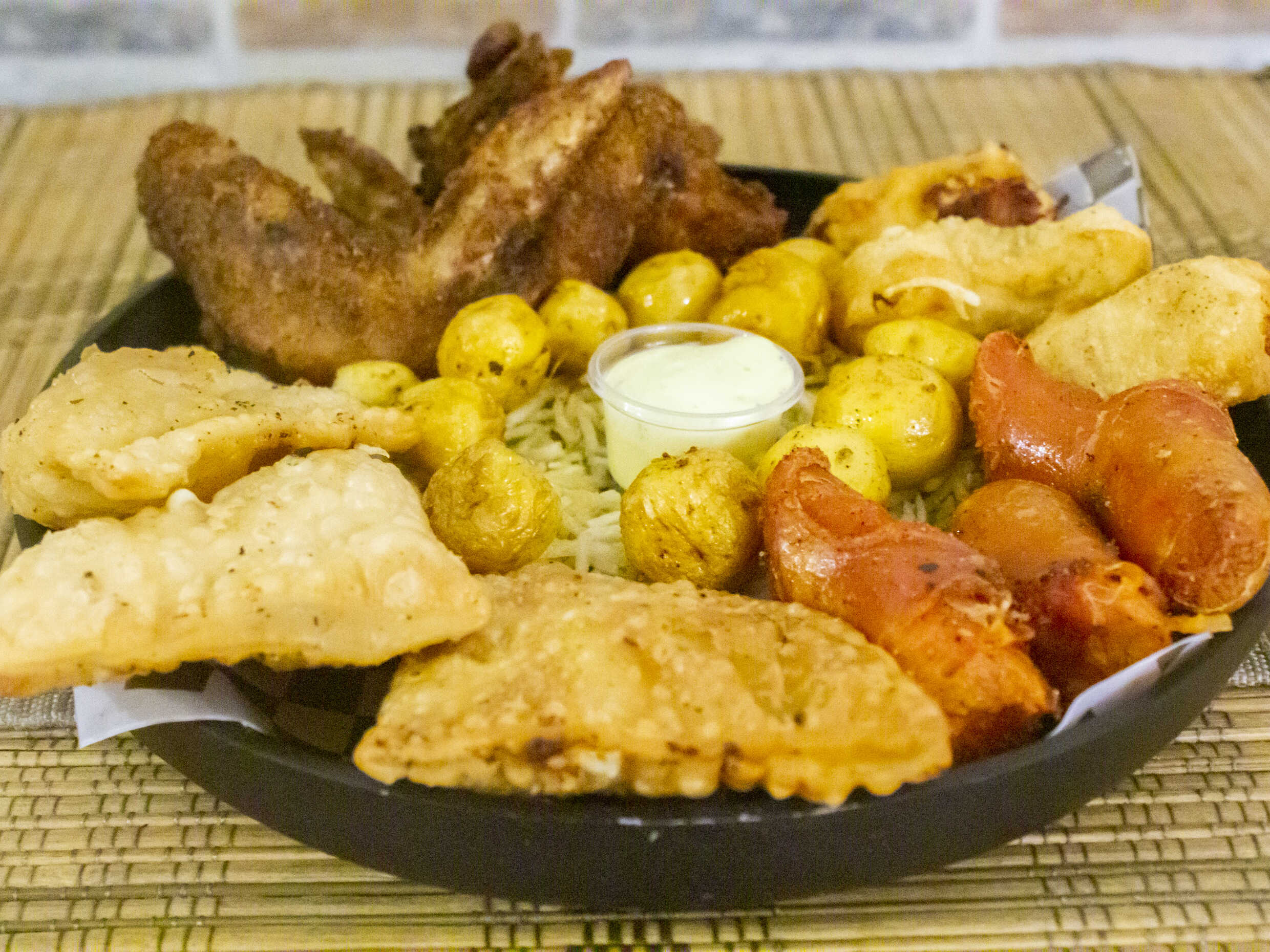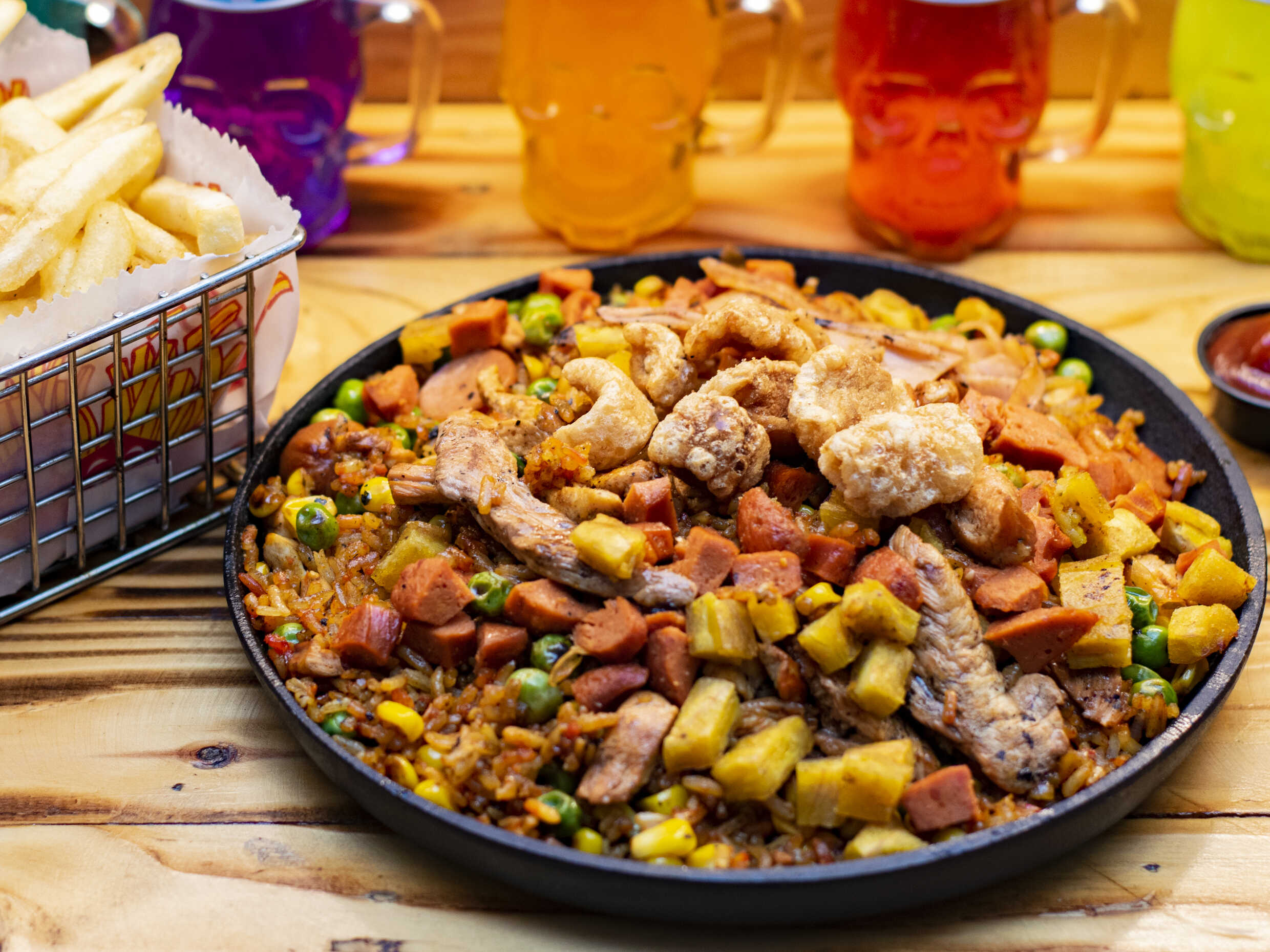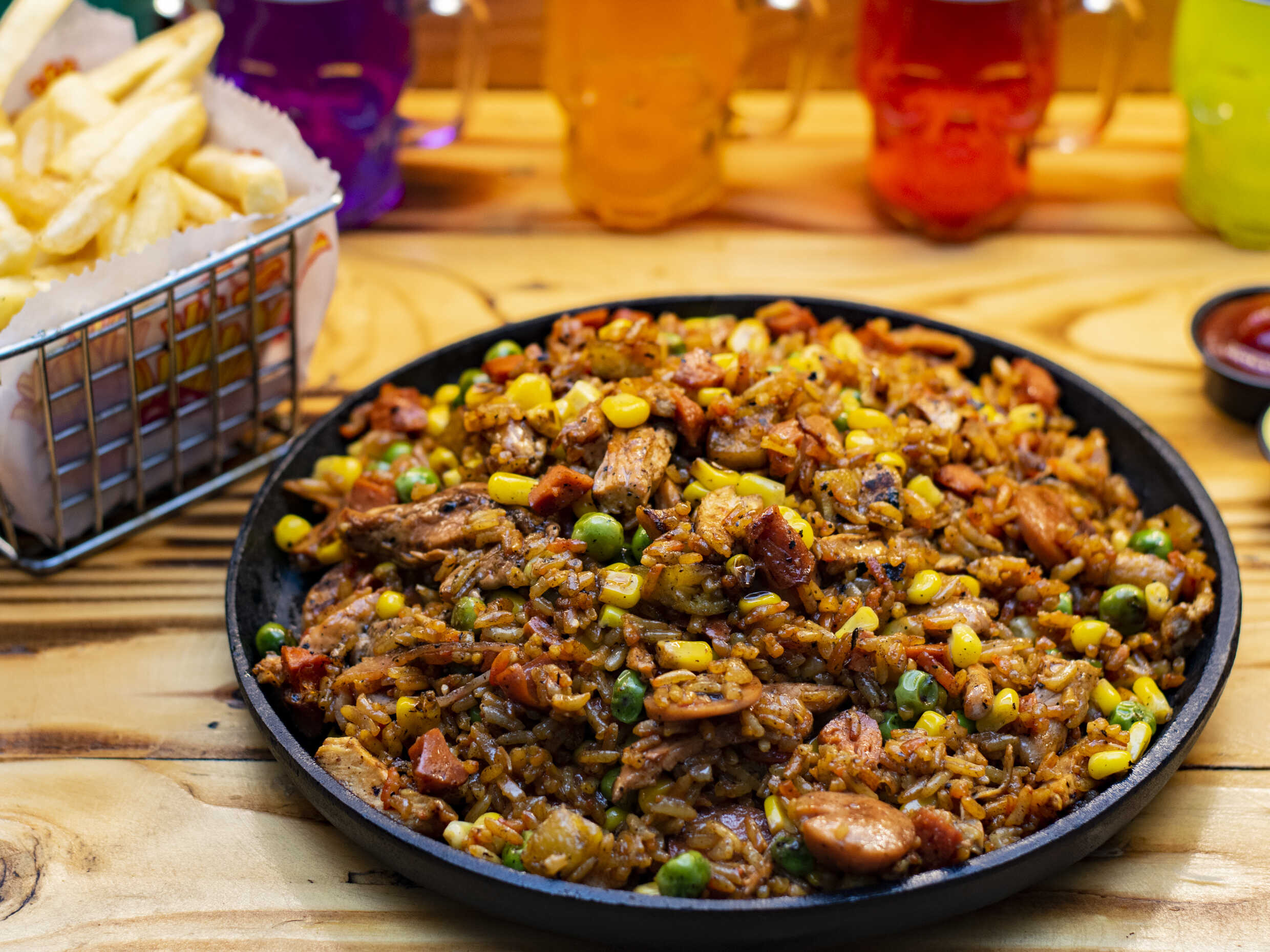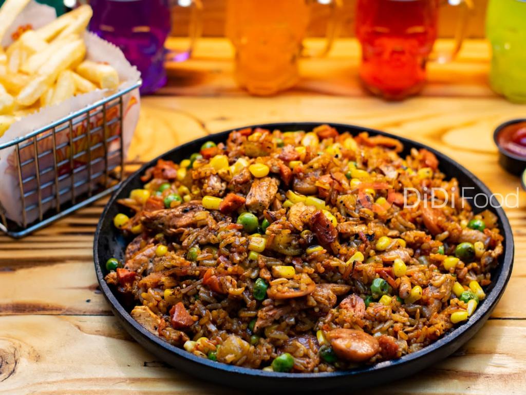 Arroz 150 g, salchicha Ranchera, trocitos de pollo, tocineta ahumada, chorizo ahumado, cebollín, soya, mazorca desgranada, papa a la francesa.