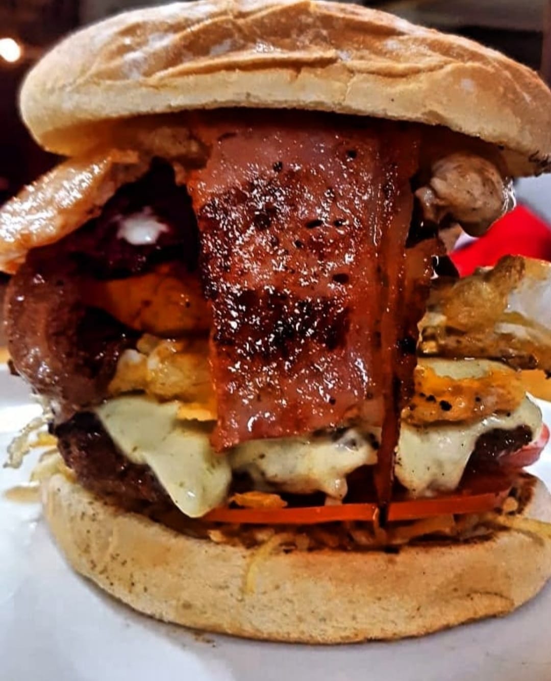 Pan artesanal, lechuga crespa, tomate, cebolla caramelizada, carne artesanal 180 g, lomo de cerdo 180 g, carne asada 180 g, pechuga 180 g, chorizo, jamón, queso fundido, huevo frito, tocineta ahumada, papas chips, salsas de la casa.