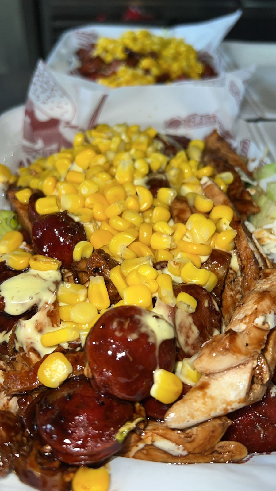 Postobon 250 ml (Disponibilidad del Restaurante)*2 + Mazorcada Papa francesa, lechuga lisa, papa chips, trocitos de pollo, trocitos de carne, salchicha, tocineta, queso costeño, mazorca desgranada, salsa de la casa*