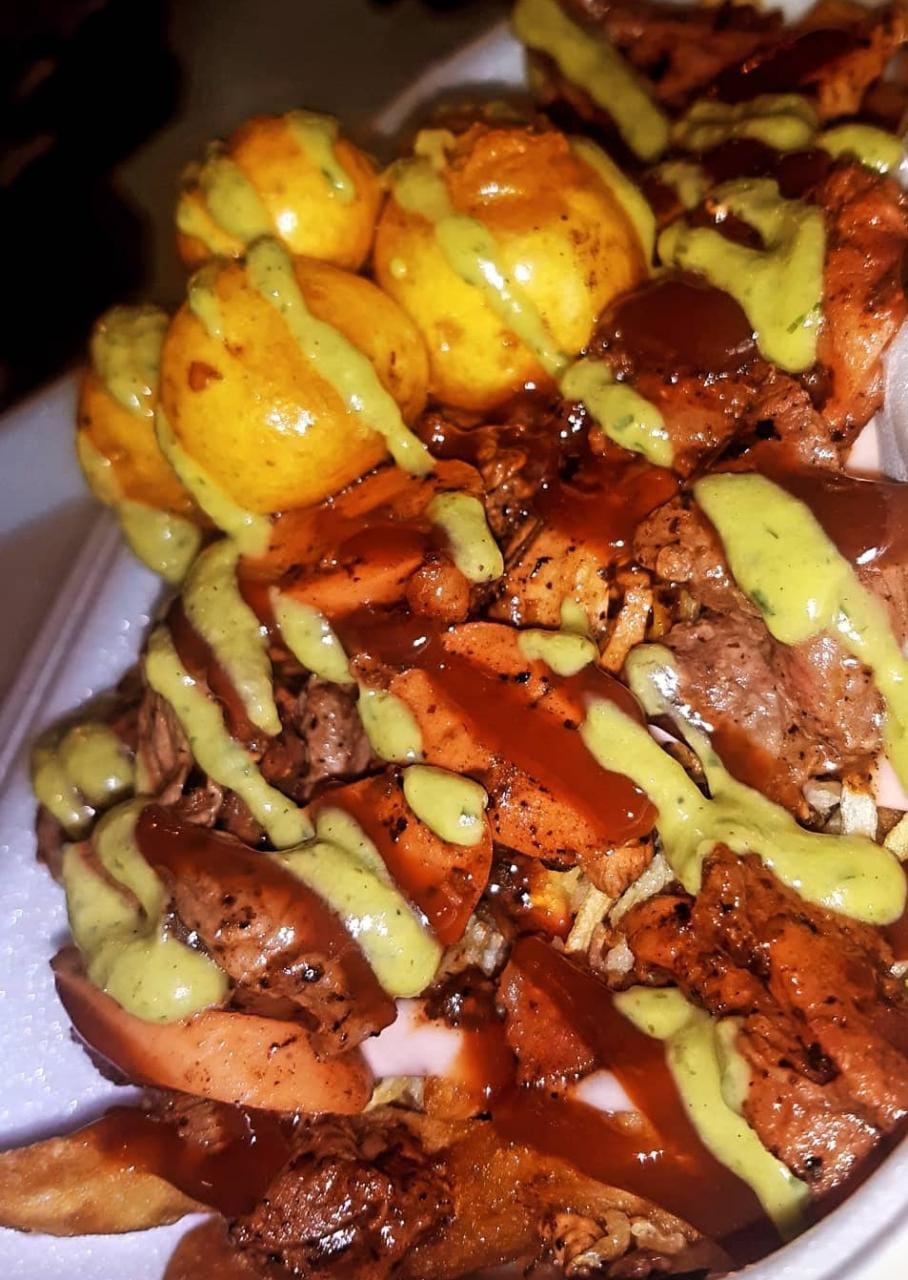 Papa Criolla, carne, pollo, chorizo, salchicha americana, tocineta, daditos de queso, patacón, doble queso, lechuga lisa, salsas tártara.