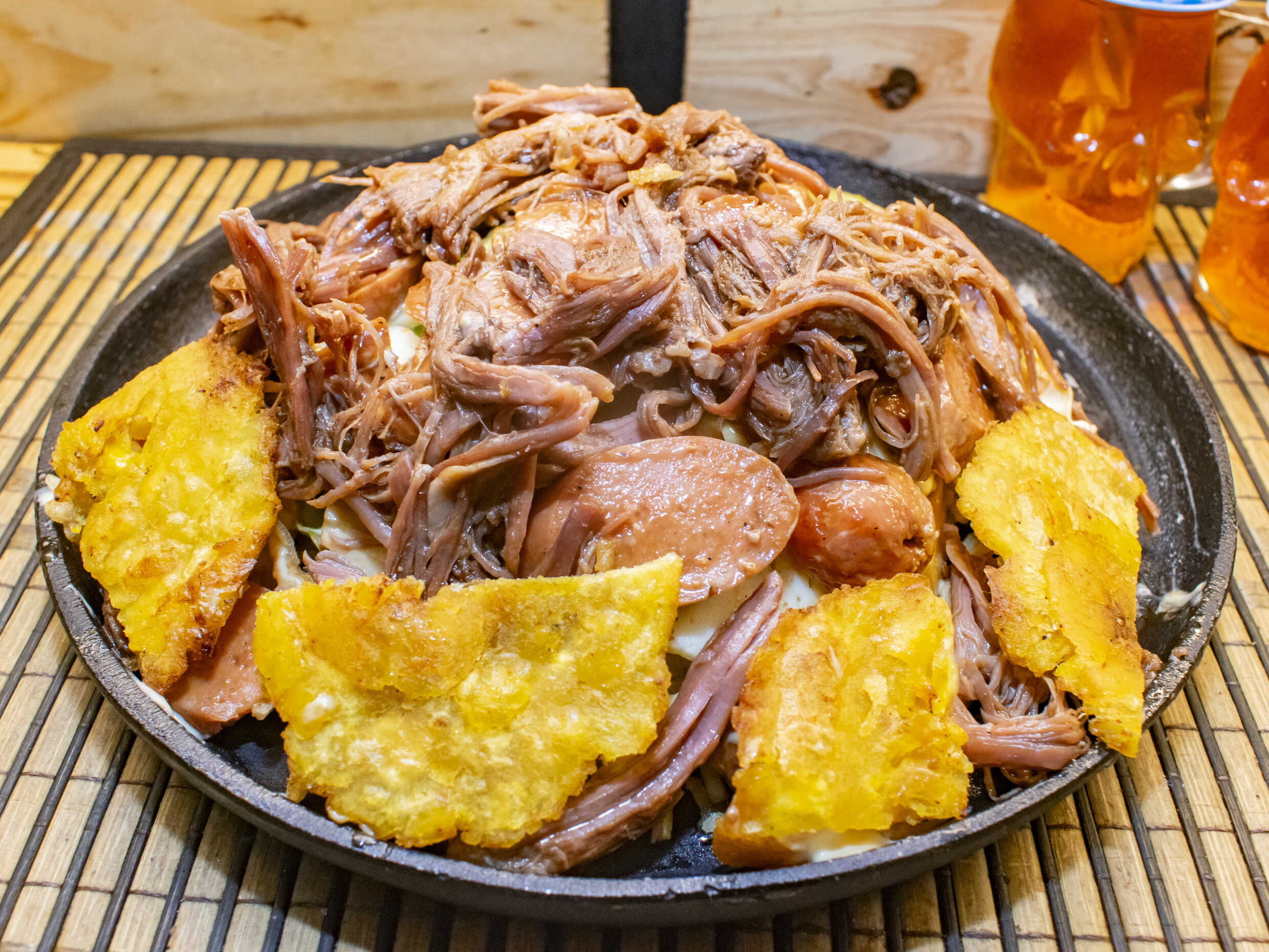 Papa francesa, salchicha americana, queso costeño, carne desmechada, tajadas de plátano maduro, papas chips, lechuga lisa, salsas de la casa