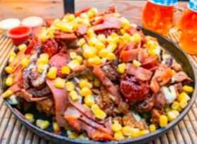 Arroz 150 g, salchicha Ranchera, trocitos de pollo, tocineta ahumada, chorizo ahumado, cebollín, soya, mazorca desgranada, papa a la francesa.