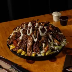 Papa francesa, lechuga lisa, papa chips, chorizo artesanal, morcilla, aderezo picante, queso gratinado, mazorca desgranada, salsa de la casa
