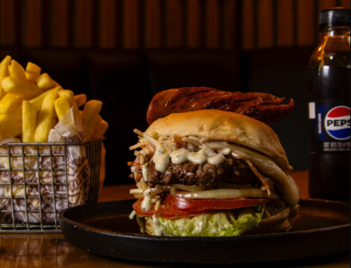Pan artesanal, lechuga, tomate, cebolla caramelizada, carne artesanal 200 g, jamón, queso fundido, papas chips, salsas de la casa.