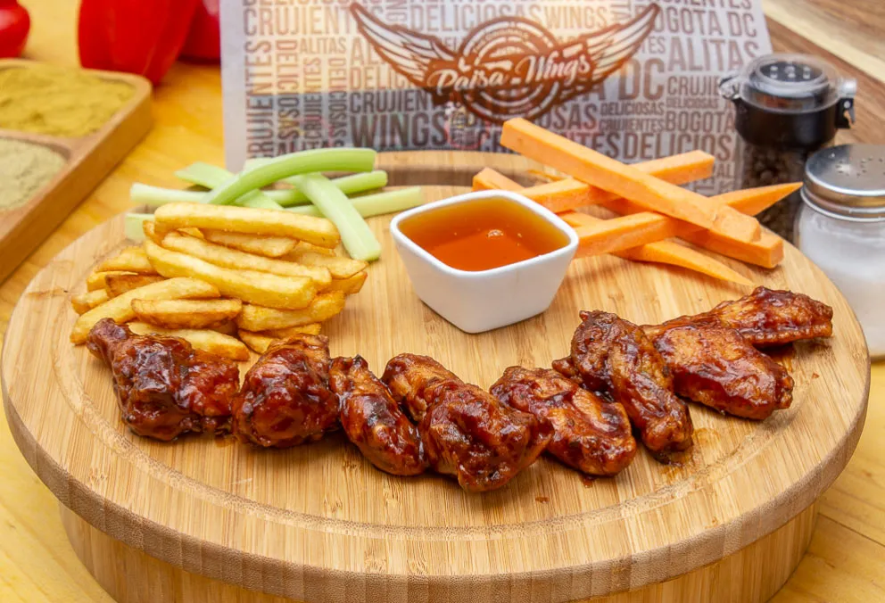 Alas 24 piezas bañadas con salsa a elección, vegetales y papas a la francesa.