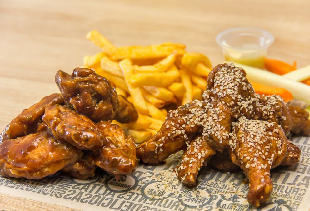 Mix de tenders y alas, acompañadas de apio y zanahoria, con salsas a elección y papas a la francesa.