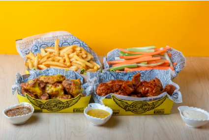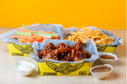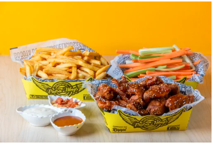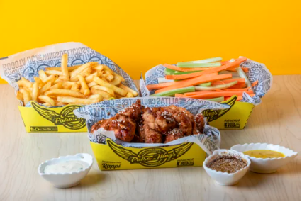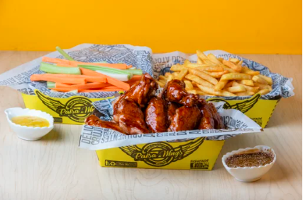 Tenders y alas 24 piezas bañadas con salsa a elección, vegetales y papas a la francesa.
