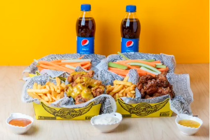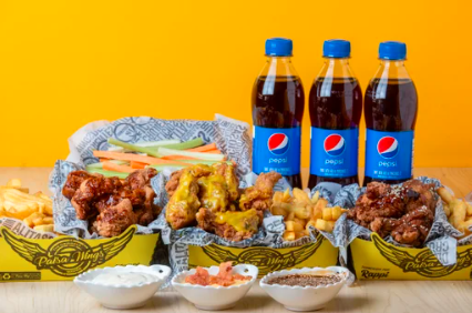 Mix 34 unidades de tenders y alas, acompañadas de apio y zanahoria, con salsas a elección y papas a la francesa + 3 gaseosas.