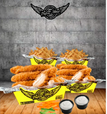 Chicken tenders y alas 54 piezas bañadas con salsa a elección, vegetales y papas a la francesa.