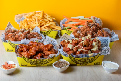 Tenders y alas 34 piezas bañadas con salsa a elección, vegetales y papas a la francesa.