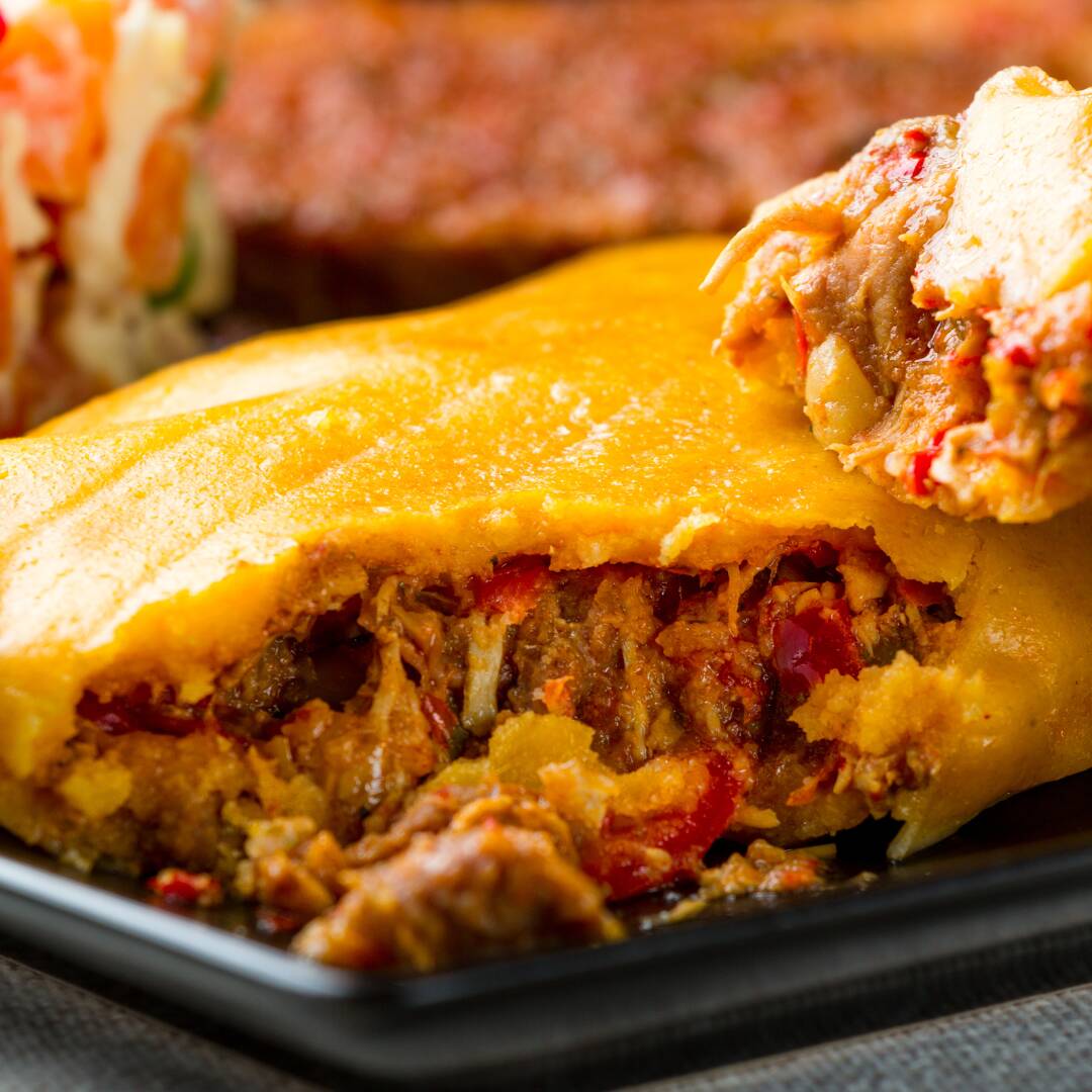 PaqueteX2 Unidades. La hallaca es la reina del plato típico Decembrino Venezolano. Su guiso es de cerdo, res y pollo, decorada con uvas pasas, aceitunas y julianas de pimentón. Imagen Referencial