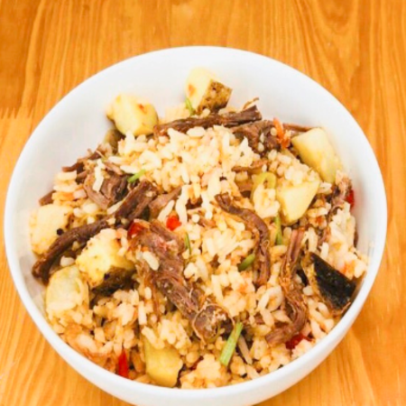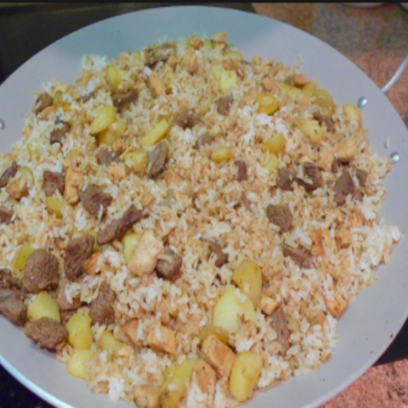 Arroz, pasta, pollo desmechado, huevo