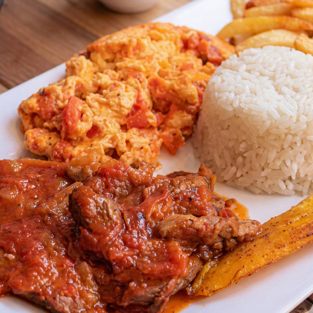 Carne, arroz huevo papa y bebida a elección.