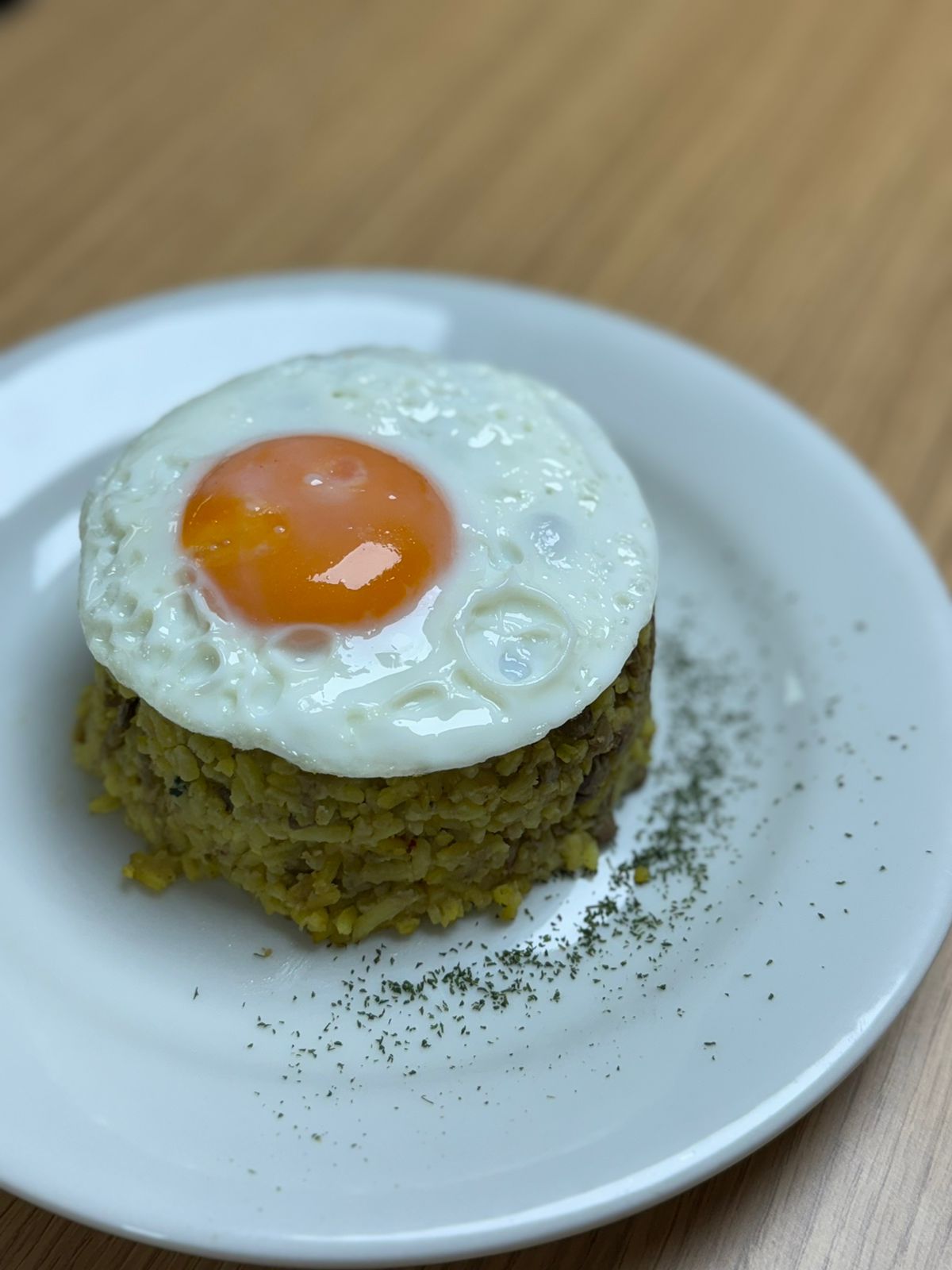 Calentado revuelto de lentejas con arroz, acompañado de huevo frito.