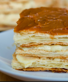 Deliciosa milhoja con capas de hojaldre crema y arequipe.
