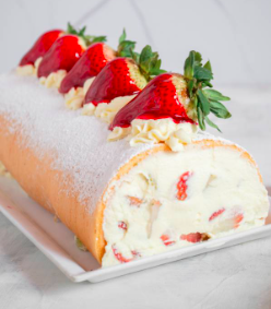 Delicioso postre de brazo de reina con crema y fresas para 12 porciones.