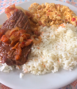 Arroz, carne en bistec, aguacate, papa y huevos al gusto.