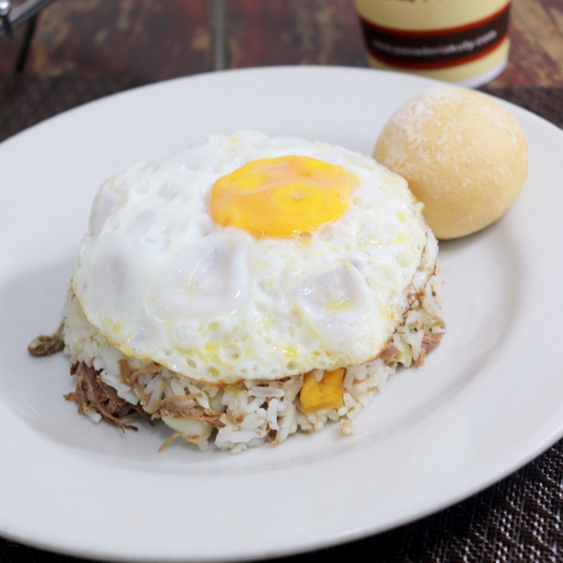 Calentado con arroz, carne, papa, tocineta, frijol, maduro, chicharrón y huevo.