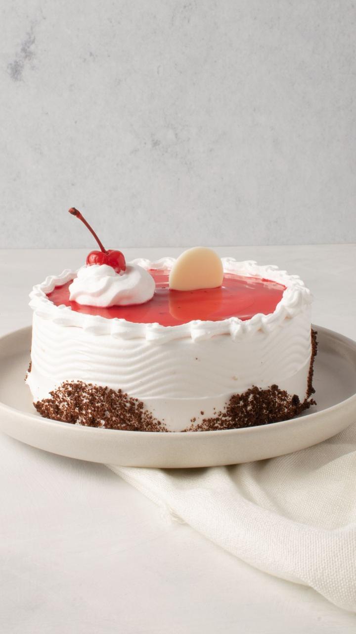 Torta remojada en jarabe tres leches con una capa de chocolate blanco, con decorado en el centro del chocolate negro y fresas, 10 porciones.