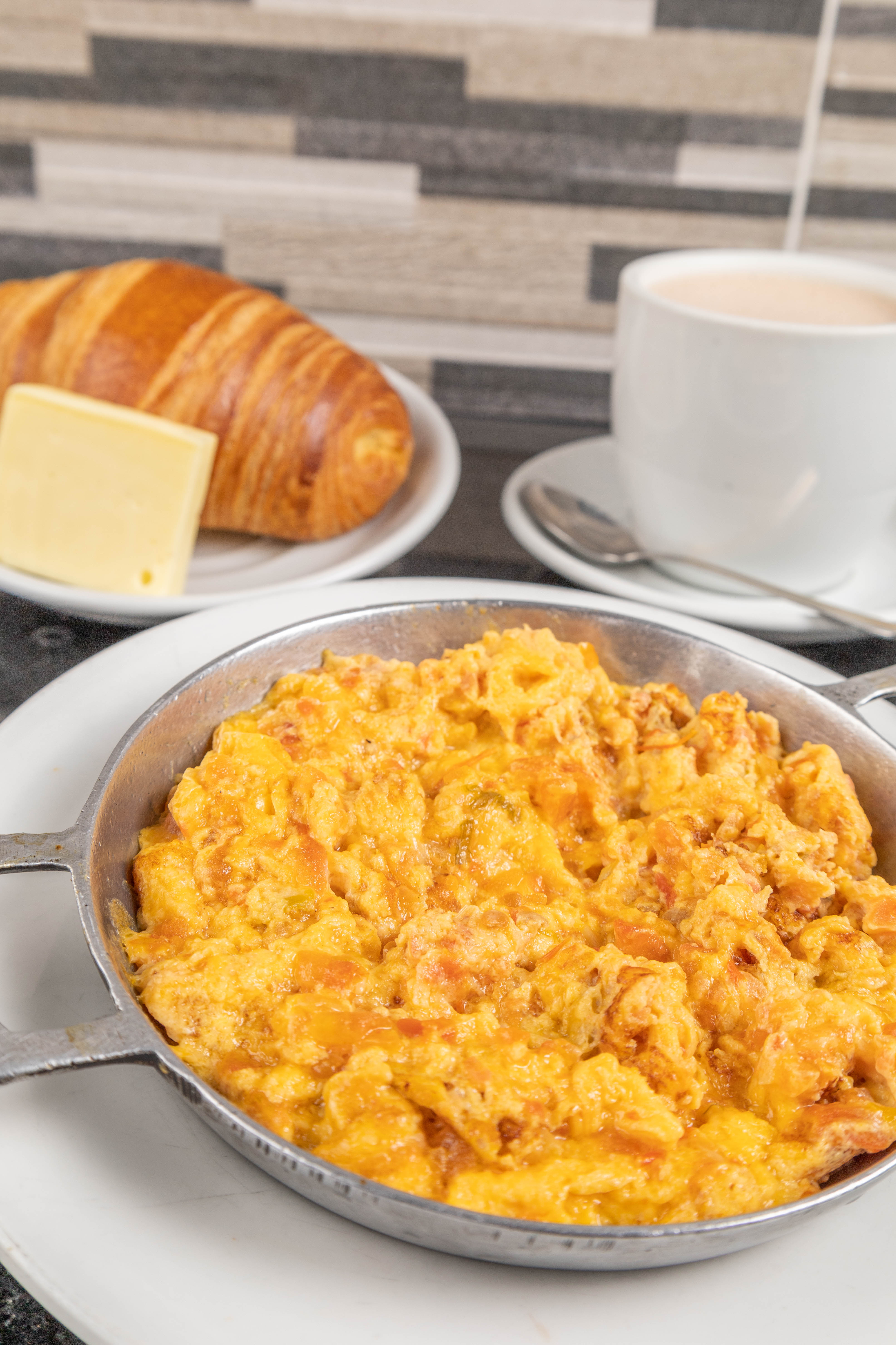 Dos huevos a elección, pan, queso y chocolate.