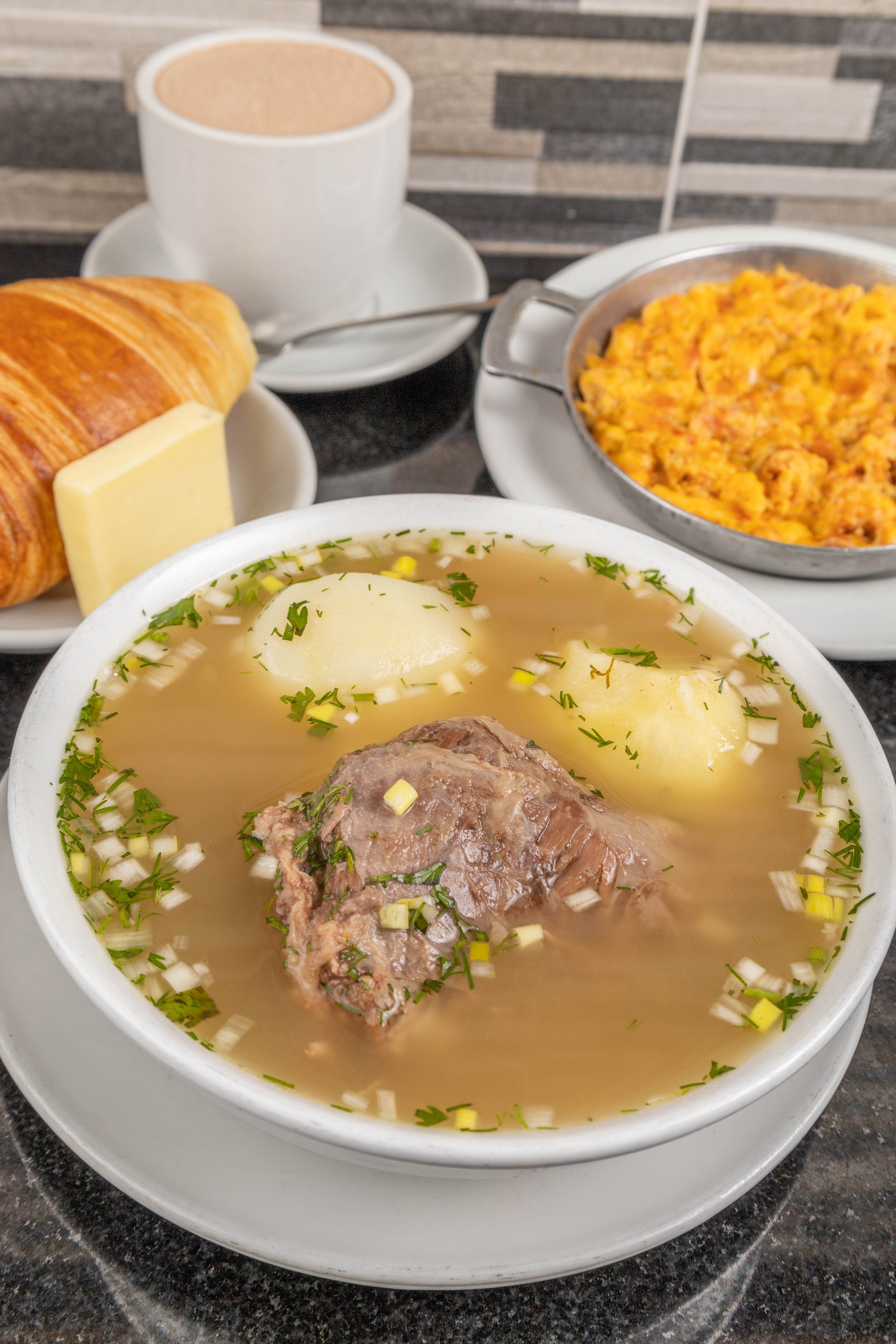 Caldo de costilla o de pescado, huevos a elección, queso, pan y chocolate.