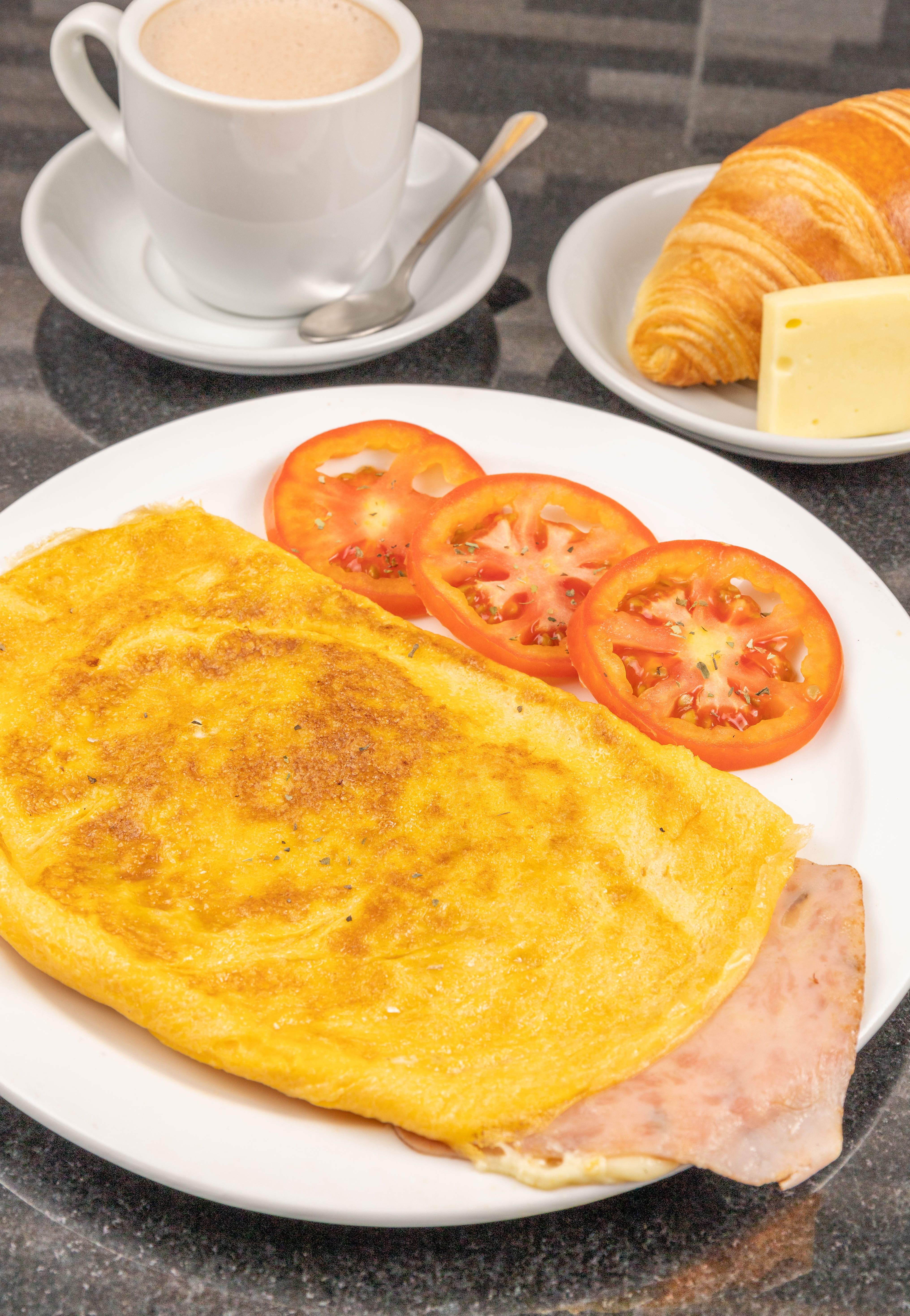 Omelette sencillo, queso, pan y chocolate.
