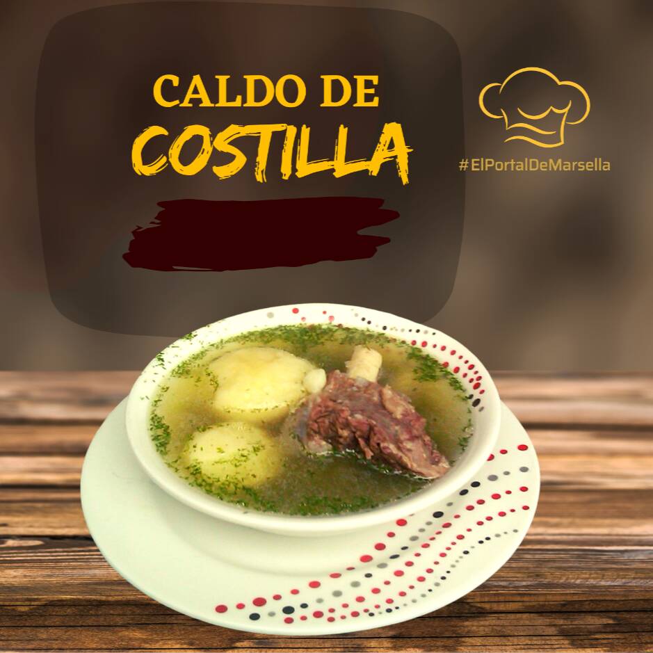 Caldo de costilla, huevos fritos al gusto, bebida 9 oz a elección y 2 panes o arepa