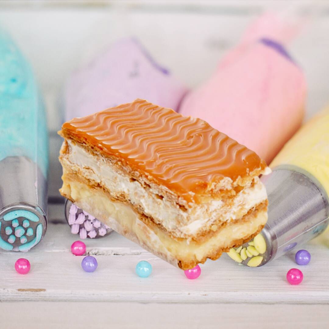 Postre milhojas 3 capas de masa horneada de hojaldre rellenos de exquisita crema pastelera y cubierto con dulce de leche o arequipe.