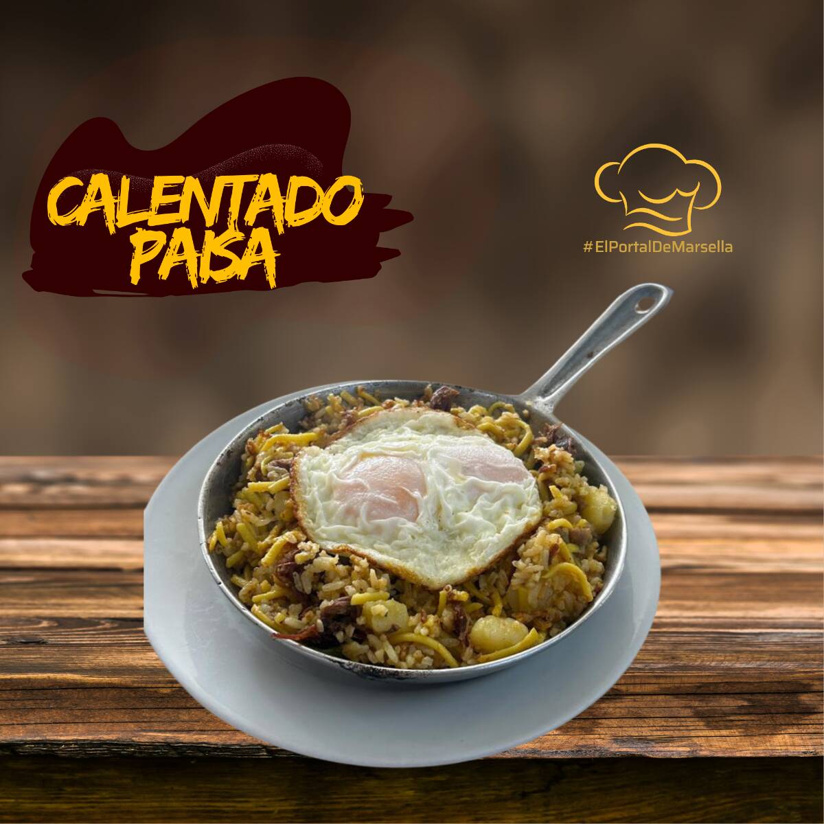 Los arrieros de la región cafetera acostumbraban desayunar con calentao. Carne desmechada, arroz, frijol, papa y huevo frito.