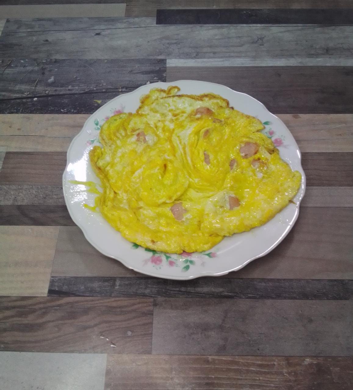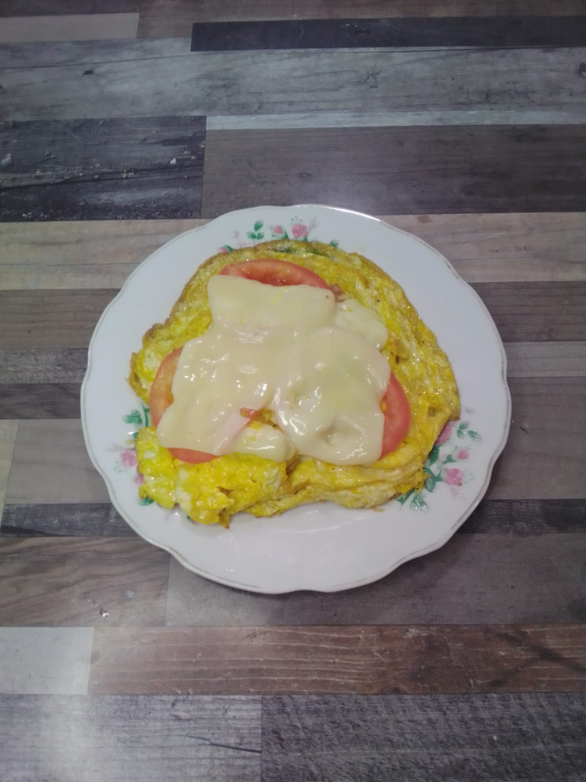 Delicioso huevos con salchicha ranchera, revueltos con unas rodajitas de tomate y queso por encima, acompañado de 2 panes.