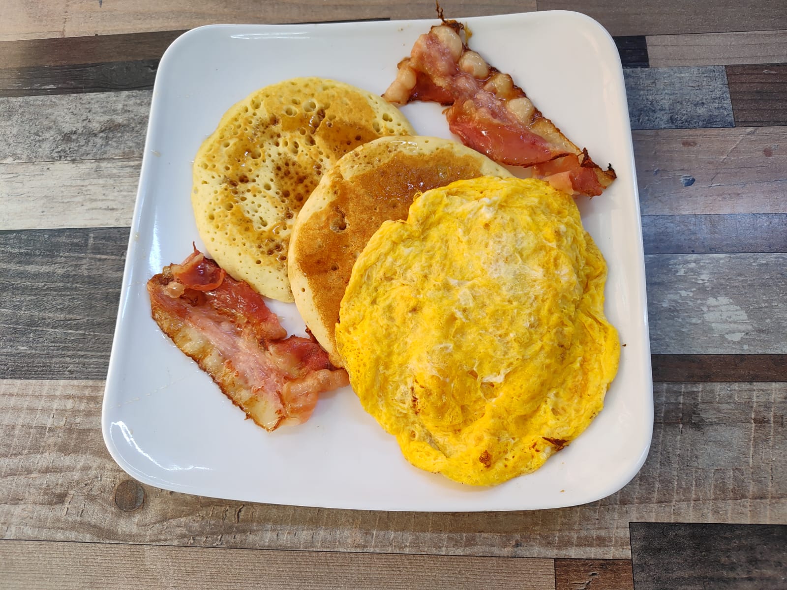1 porcion personal Delicioso desayuno completo con huevos al gusto, 2 pancake hechos de harina de trigo con miel de maple, 2 lonjas de tocineta.