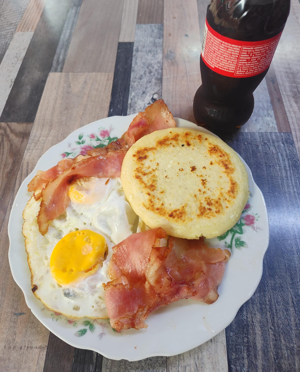 Combo de arepa, huevos al gusto, tocineta y gaseosa