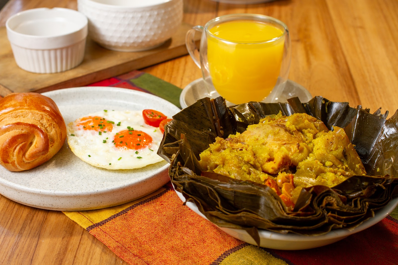 Tamal tolimense, acompañado de huevos al gusto, bebida y pan.