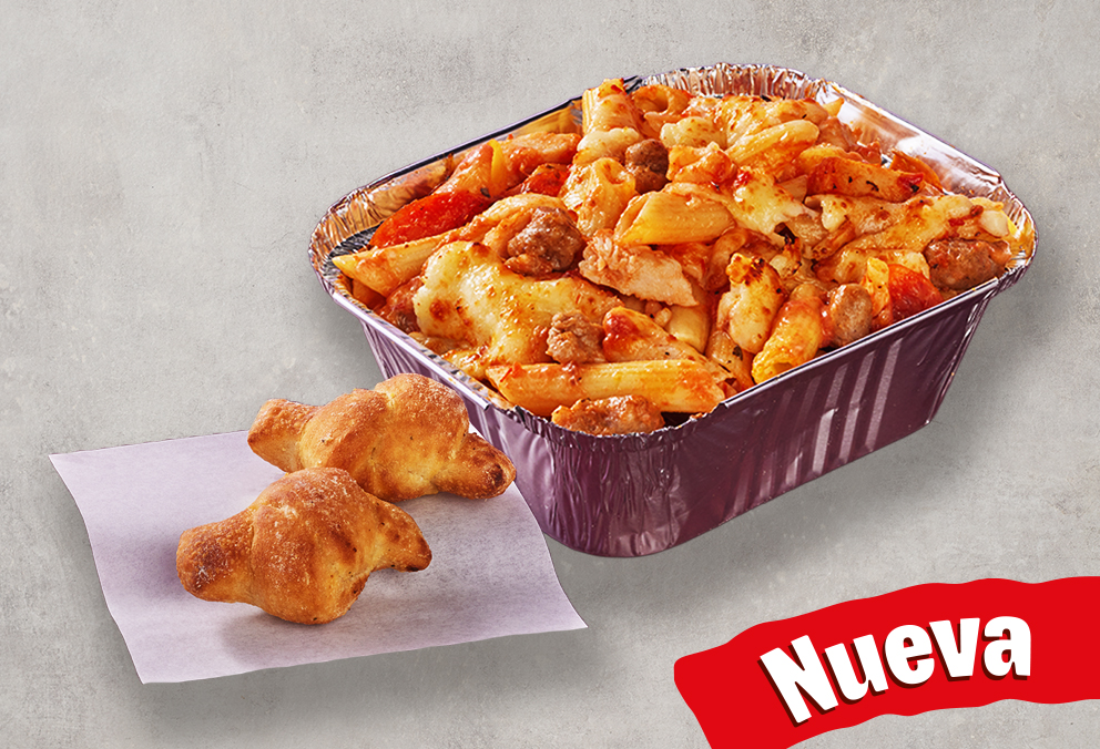 Pasta corta con pollo, pepperoni, salchicha de cerdo y queso mozzarella. Con mezcla de salsa pizza, bechamel y ajo,. Acompañada de dos knots de pan recién horneados.